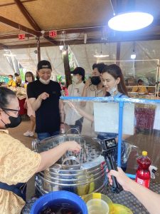 งานนี้ทั้ง บอย & เจี๊ยบ ก็ทำหน้าที่พาทัวร์ทั่วทั้งตลาดทั้งกิน ทั้งชิม กันแบบจุๆไม่ว่าจะเป็น การกินเมี่ยง ไอติมแท่ง และอาหารไทยชุดใหญ่ไฟกระพริบที่ พาร์ค ยูชอน ก็เอ็นจอยทริปมาก เพราะเจ้าตัวชื่นชอบอาหารไทย และรักในความเป็นไทยที่สุด