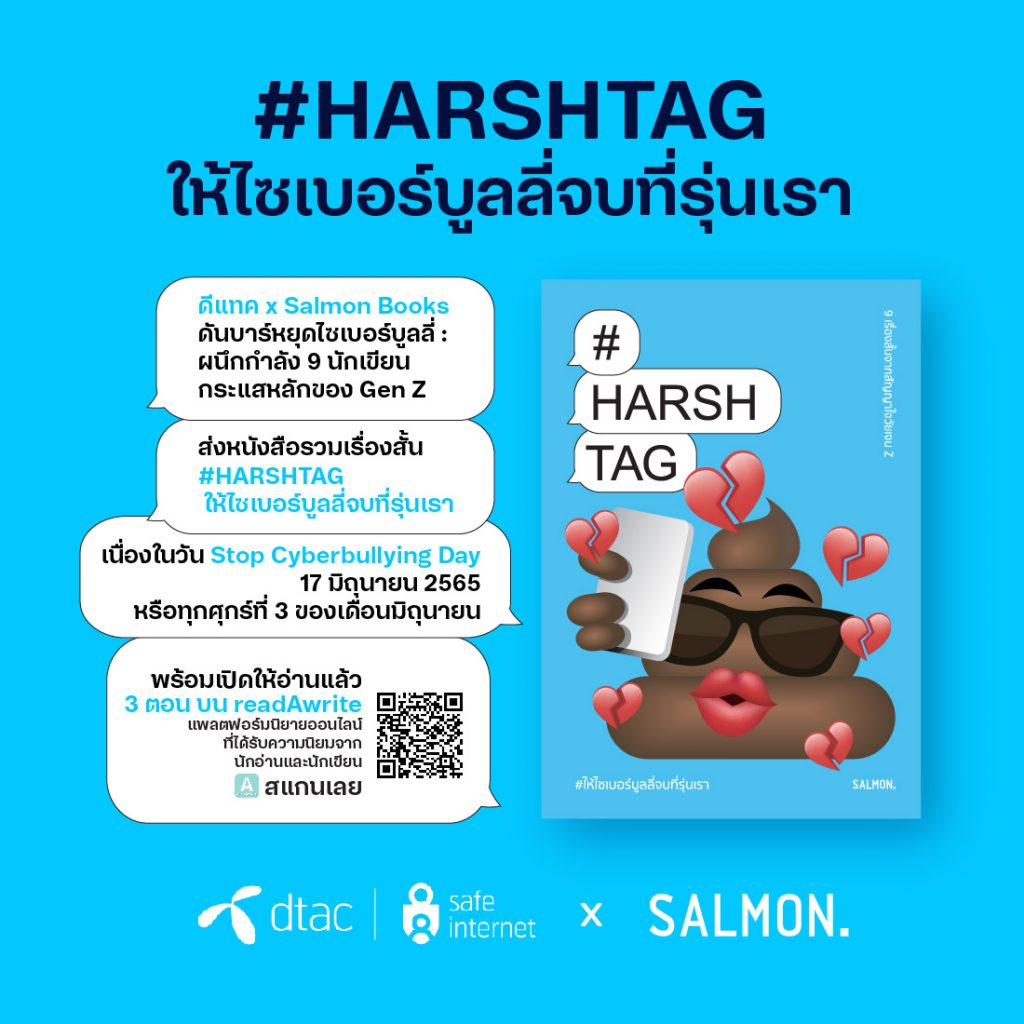 เนื่องในวันต่อต้านการกลั่นแกล้งทางออนไลน์สากล 2565 (#StopCyberbullyingDay) หนังสือรวมเรื่องสั้น #HARSHTAG ให้ไซเบอร์บูลลี่จบที่รุ่นเรา พร้อมเปิดเรื่องสั้น 3 ตอน ให้อ่านได้แล้ววันนี้ ที่แพลตฟอร์ม ReadAWrite โดยประกอบไปด้วย