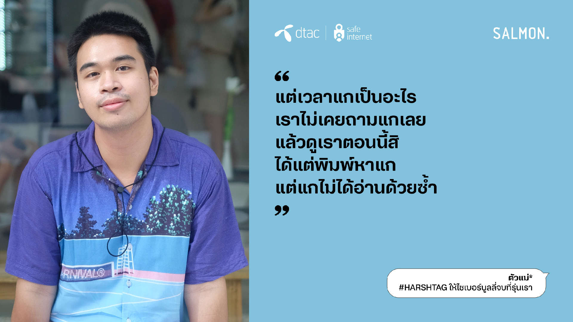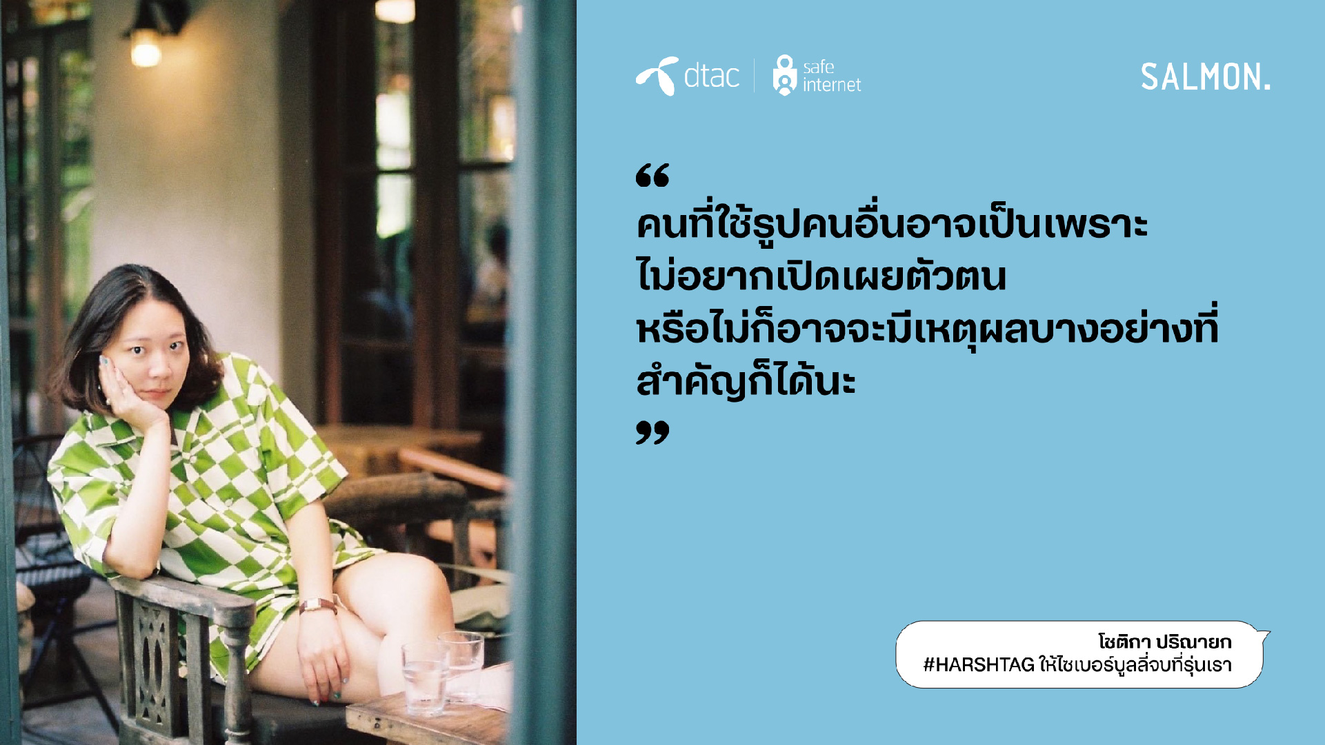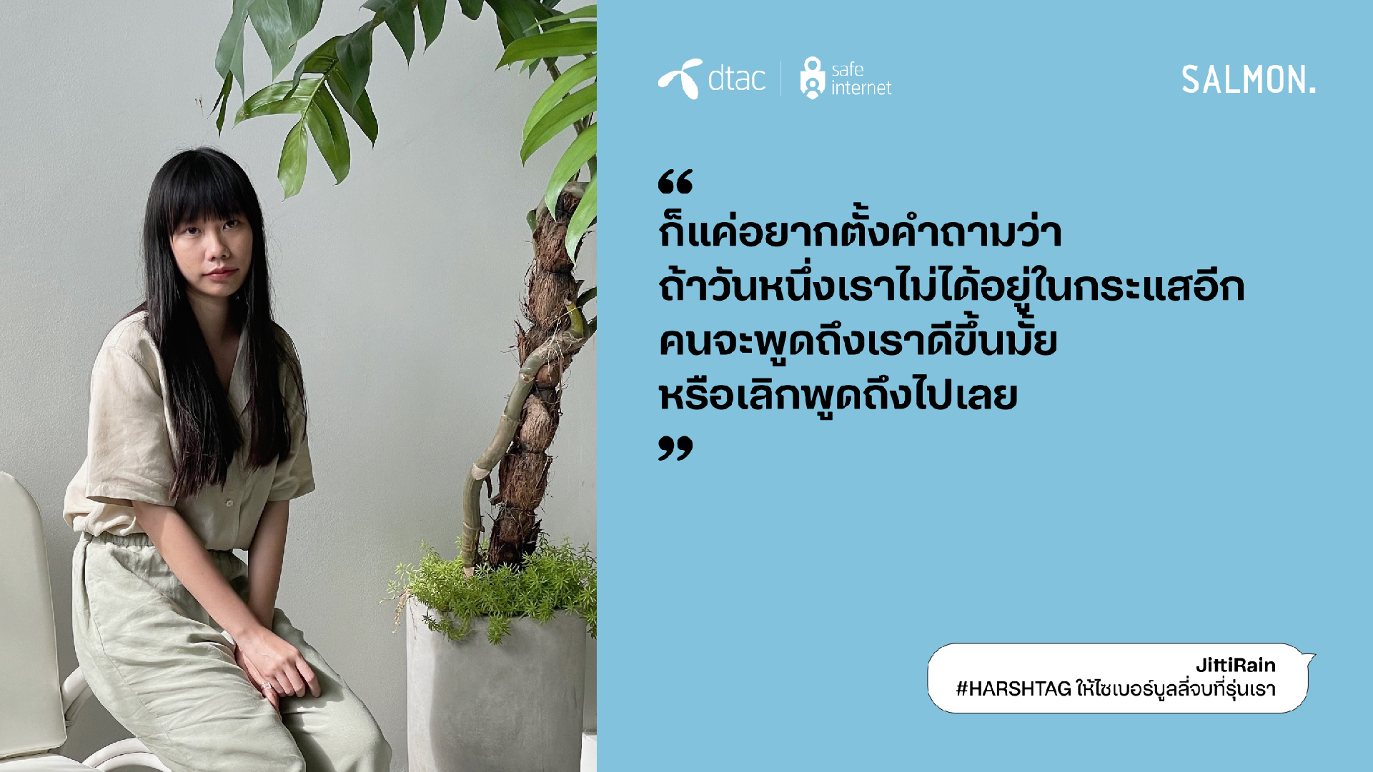 นางอรอุมา ฤกษ์พัฒนาพิพัฒน์ ผู้อำนวยการอาวุโส สายงานสื่อสารองค์กรและความยั่งยืน บริษัท โทเทิ่ล แอ็คเซ็ส คอมมูนิเคชั่น จำกัด (มหาชน) หรือดีแทค กล่าวว่า “ดีแทคให้ความสำคัญกับวันต่อต้านไซเบอร์บูลลี่สากลต่อเนื่องมาเป็นปีที่ 7 ในปีนี้ ด้วยความตระหนักถึงหน้าที่ความรับผิดชอบในฐานะบริษัทที่ให้บริการอินเทอร์เน็ตและบริการดิจิทัล ต่อความเสี่ยงบนโลกออนไลน์ที่มีผู้ใช้งานมากกว่า 28% ในไทยเป็นเด็กและเยาวชน โครงการ dtac Safe Internet ยังคงเดินหน้าให้ความรู้สร้างภูมิคุ้มกันบนโลกออนไลน์ และเป็นภาคีสำคัญในการร่วมหาทางออกและลดความรุนแรงจากภัยออนไลน์ ซึ่งไซเบอร์บูลลี่เป็นประเด็นปัญหาในลำดับต้นๆ ที่เยาวชนไทยตระหนักถึงอันตรายและอยากเข้ามามีส่วนร่วมในการแก้ปัญหา ในปีนี้ ดีแทคได้ร่วมกับสำนักพิมพ์แซลมอน หยิบข้อเสนอของเยาวชนใน ‘สัญญาใจวัย Gen Z’ มาถ่ายทอดเป็นเรื่องสั้นที่เปิดเผยถึงค่านิยม ทัศนคติ และประสบการณ์ของคนรุ่นใหม่ และสอดแทรกด้วยแนวทางปฏิบัติที่ใช้ได้จริงทั้ง 23 ข้อ เพื่อหยุดไซเบอร์บูลลี่ ซึ่งรายได้ทั้งหมดจากการจัดจำหน่ายหนังสือ ดีแทคจะส่งต่อให้สำนักพิมพ์แซลมอน (Salmon Books) ทั้งหมดโดยไม่หักค่าใช้จ่าย”