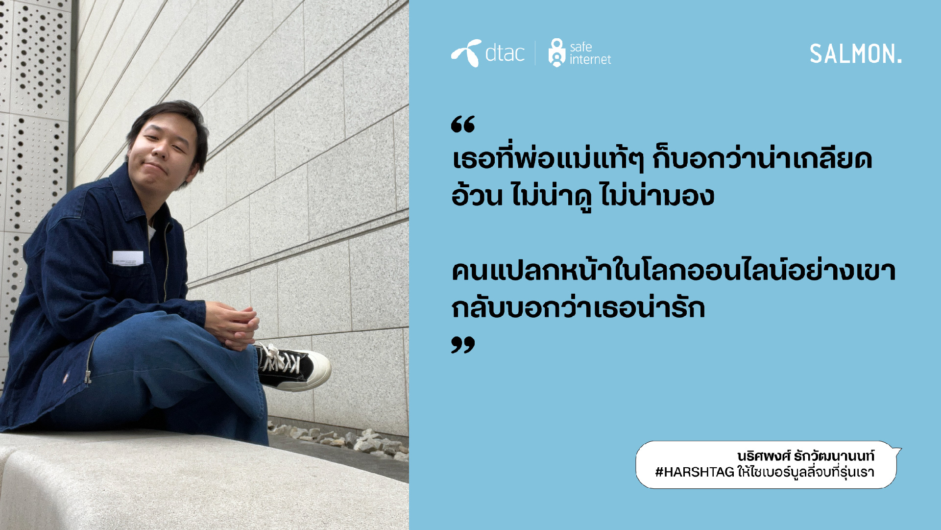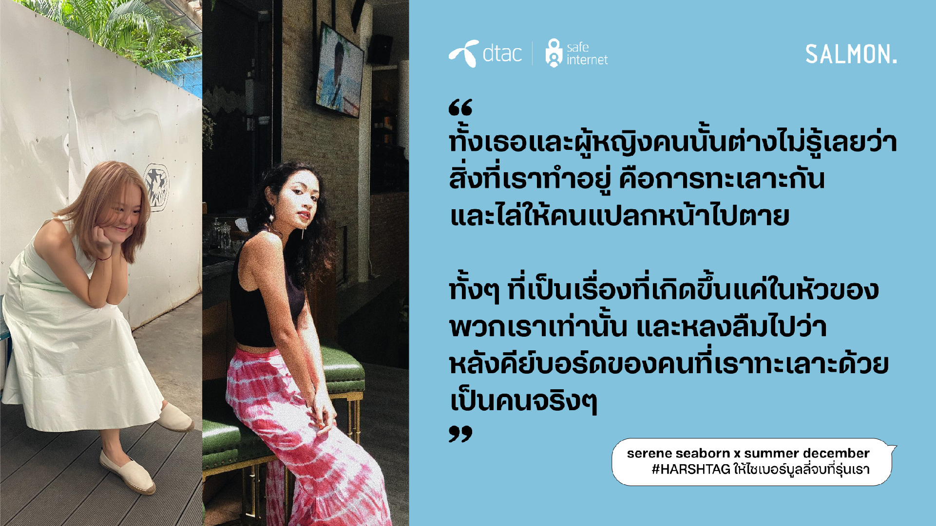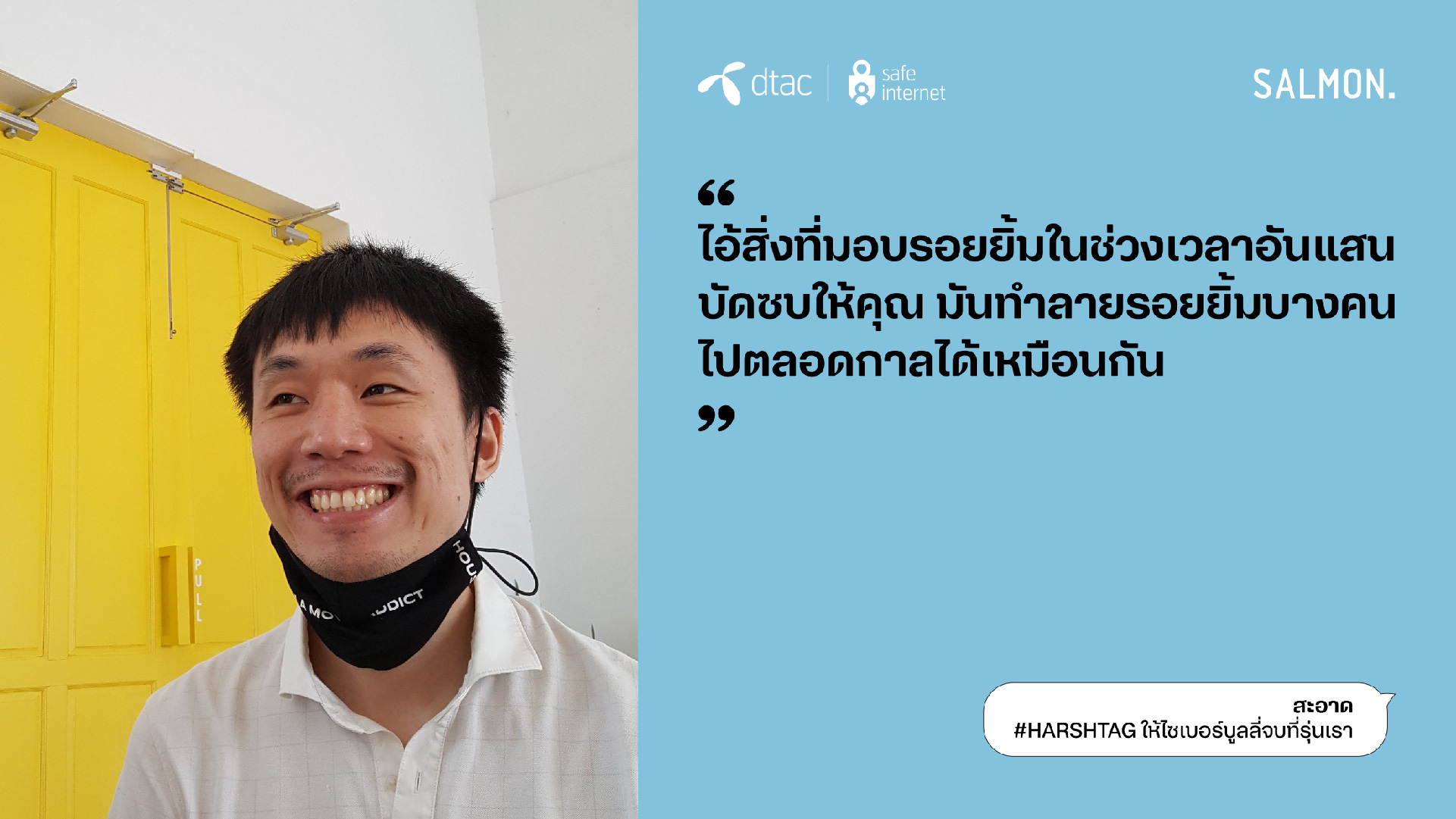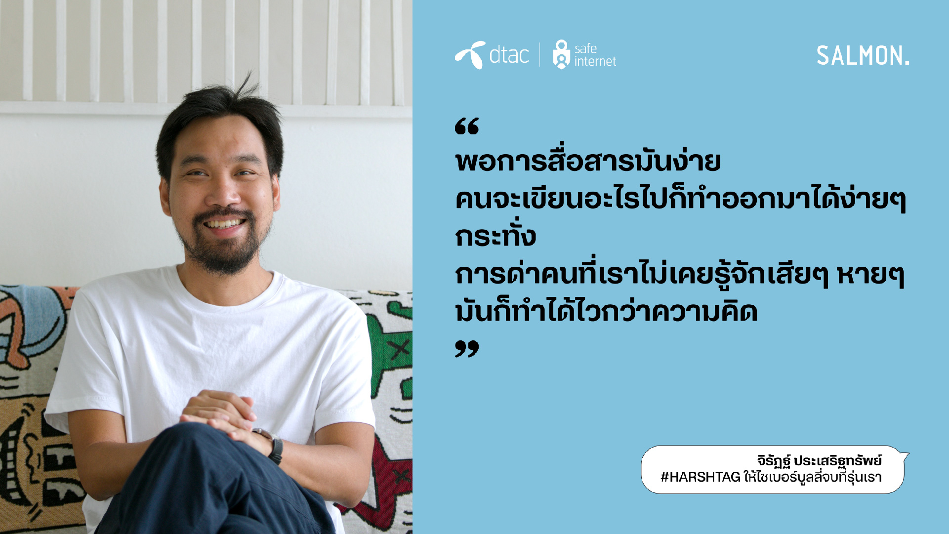 นางอรอุมา ฤกษ์พัฒนาพิพัฒน์ ผู้อำนวยการอาวุโส สายงานสื่อสารองค์กรและความยั่งยืน บริษัท โทเทิ่ล แอ็คเซ็ส คอมมูนิเคชั่น จำกัด (มหาชน) หรือดีแทค กล่าวว่า “ดีแทคให้ความสำคัญกับวันต่อต้านไซเบอร์บูลลี่สากลต่อเนื่องมาเป็นปีที่ 7 ในปีนี้ ด้วยความตระหนักถึงหน้าที่ความรับผิดชอบในฐานะบริษัทที่ให้บริการอินเทอร์เน็ตและบริการดิจิทัล ต่อความเสี่ยงบนโลกออนไลน์ที่มีผู้ใช้งานมากกว่า 28% ในไทยเป็นเด็กและเยาวชน โครงการ dtac Safe Internet ยังคงเดินหน้าให้ความรู้สร้างภูมิคุ้มกันบนโลกออนไลน์ และเป็นภาคีสำคัญในการร่วมหาทางออกและลดความรุนแรงจากภัยออนไลน์ ซึ่งไซเบอร์บูลลี่เป็นประเด็นปัญหาในลำดับต้นๆ ที่เยาวชนไทยตระหนักถึงอันตรายและอยากเข้ามามีส่วนร่วมในการแก้ปัญหา ในปีนี้ ดีแทคได้ร่วมกับสำนักพิมพ์แซลมอน หยิบข้อเสนอของเยาวชนใน ‘สัญญาใจวัย Gen Z’ มาถ่ายทอดเป็นเรื่องสั้นที่เปิดเผยถึงค่านิยม ทัศนคติ และประสบการณ์ของคนรุ่นใหม่ และสอดแทรกด้วยแนวทางปฏิบัติที่ใช้ได้จริงทั้ง 23 ข้อ เพื่อหยุดไซเบอร์บูลลี่ ซึ่งรายได้ทั้งหมดจากการจัดจำหน่ายหนังสือ ดีแทคจะส่งต่อให้สำนักพิมพ์แซลมอน (Salmon Books) ทั้งหมดโดยไม่หักค่าใช้จ่าย”