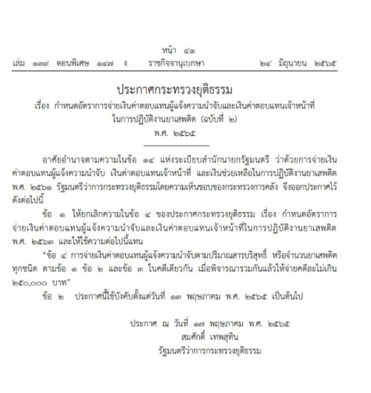 เว็บไซต์ราชกิจจานุเบกษา เผยแพร่ประกาศกระทรวงยุติธรรม เรื่อง กำหนดอัตราการจ่ายเงินค่าตอบแทนผู้แจ้งความนำจับและเงินค่าตอบแทนเจ้าหน้าที่ในการปฏิบัติงานยาเสพติด (ฉบับที่ 2) พ.ศ. 2565