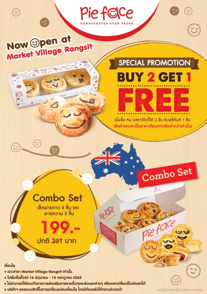 Vพาย เฟสซ์ (Pie Face) พายสูตรลับอารมณ์ดี ที่คงเอกลักษณ์ของเนื้อพายสี่เลเยอร์ กรอบนอกนุ่มในสไตล์โฮมเมดจากออสเตรเลีย พร้อมแล้วที่จะมาเปิดเตาอบพายอีโมติคอนแสนน่ารักทั้ง คาวหวาน เสิร์ฟร้อนๆ กับพายหอมๆรสชาติยอดนิยม อาทิ Chunky Steak Pie (พายเสต็กเนื้อ), Chicken and Mushroom Pie (พายไก่ และเห็ด), Spinach Pie (พายผักโขม), Bacon Triple Cheese Pie (พายเบคอนทริปเปิ้ลชีส), Salted Egg Lava Pie (พายไข่เค็มลาวา), Apple Pie (พายแอปเปิ้ล) Strawberry Pie (พายสตรอว์เบอรี่) , Cream Custard Pie (พายครีมคัสตาร์ด) ให้กับชาวรังสิต ที่ Market Village รังสิต พร้อมโปรโมชั่นเด็ดมัดใจ เมื่อซื้อพายรสชาติใดก็ได้ 2 ชิ้น รับเพิ่ม 1 ชิ้น ทันที ! หรือจะอิ่มแบบเซ็ทคอมโบกับ พายคาว 3 ชิ้น และพายหวาน 3 ชิ้น ในราคาเพียง 199.- (จากราคาปกติ 231.-) เท่านั้น
