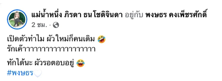 ล่าสุด แม่น้ำหนึ่ง ไม่ทำให้สงสัยนาน โพสต์ภาพคู่กันไปเลยสิคะ กับหนุ่มคนเดิม พร้อมแคปชั่นแซ่บๆว่า “เปิดตัวทำไม ผัวใหม่ก็คนเดิม รักเค๊าาาาาาาาาาาาาาาาาาา ทักได้นะ ผัวรอตอบอยู่ “
