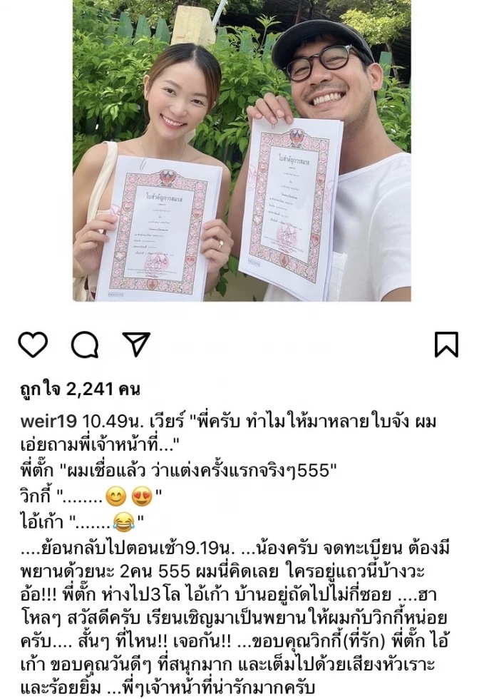 ล่าสุดเมื่อวันที่ 8สดๆ ร้อนๆหนุ่มเวียร์ ได้โพสต์ภาพคู่ว่าที่เจ้าสาว “วิกกี้” ครั้งแรกในไอจีเป็นภาพที่ทั้งคู่ควงกันไปจดทะเบียนสมรส เริ่มต้นใช้ชีวิตคู่แบบฉบับสามีภรรยาพร้อมบอกเล่าเรื่องราวว่า