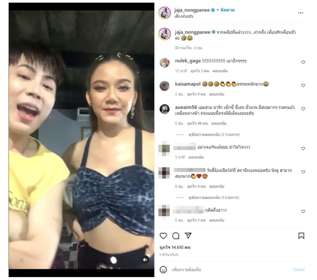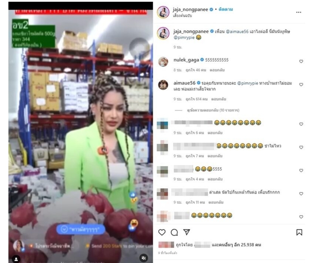 ลั่นกันจริงๆเพื่อนแก๊งนี้ จ๊ะ นงผณี โพสต์คลิป พิมรี่พาย แคปชั่น เพื่อน @aimaue56 เอาไงต่อดี นี่มันนังงูพิษ @pimrypie ขณะ พิมกำลังไลฟ์ขายของ แล้วมีคนเข้ามาทักว่า พี่จ๊ะ กับ พี่เอม เหรอค่ะ พิมรี่พาย บอกทันทีว่า กูคนละคนกันค่า พี่จ๊ะกับพี่เอม ทำงานของมันสิค่ะ อีนั่นเป็นักร้องเต้นกินรำกิน อีกคนเป็นตลกหน้าตาตลก อีกคนเป็นกะเทยขายความตลก อีกคนเป็นนักร้องขายแต่เสียงหน้าตาไม่ได้