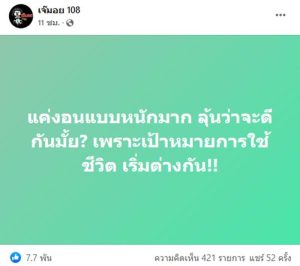 ล่าสุด “เจ๊มอย 108” ก็ได้ออกมาบอกคำใบ้เพิ่มเติมว่า “แค่งอนแบบหนักมาก ลุ้นว่าจะดีกันไหม ? เพราะเป้าหมายการใช้ชีวิต เริ่มต่างกัน !!”  งานนี้ขาเผือกก็ยิ่งคอมเมนต์กันสนั่น พร้อมฟันธงถึงคู่รักหลายคู่ในวงการ อาทิ คู่ของ ต กับ ป แน่เลย, 2p กับ lady เหรอคะ, เดี๋ยวละครจบก็คืนดีกันแล้วค่ะ, ตทพกับมป แน่ ๆ เลยยย อย่าน้าาาาา, ลดป แน่ ๆ ฯลฯ