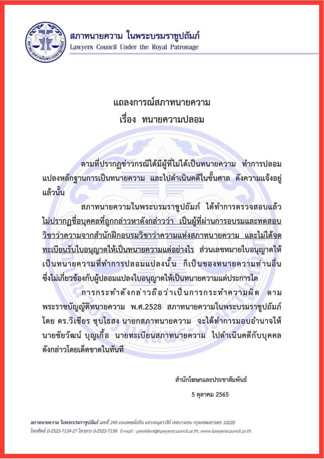 แถลงการณ์สภาทนายความ เรื่อง ทนายความปลอม