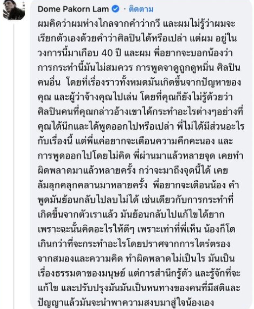 “ผมคิดว่าผมห่างไกลจากคำว่ากวี และผมไม่รู้ว่าผมจะเรียกตัวเองด้วยคำว่าศิลปินได้หรือเปล่า แต่ผมอยู่ในวงการนี้มาเกือบ 40 ปี และผม พี่อยากจะบอกน้องว่า การกระทำนี้มันไม่สมควร การพูดจาดูถูกดูหมิ่น ศิลปินคนอื่น โดยที่เรื่องราวทั้งหมด มันเกิดขึ้นจากปัญหาของคุณ และผู้ว่าจ้างคุณไปเล่น โดยที่คุณก็ยังไม่รู้ด้วยว่าศิลปินคนที่คุณกล่าวอ้าง เขาได้กระทำอะไรต่างๆอย่างที่คุณได้นึกและได้พูดออกไปหรือเปล่า
