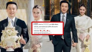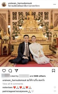 ส่วน “แม่อุไรวรรณ” คุณแม่ของ “โน้ต” ก็โพสต์ภาพอวยพรลูกชายและลูกสะใภ้ว่า “ขอให้ราบรื่น สมหวัง” ก่อนที่”โน้ต” และ “แพทริเซีย” จะเข้ามาคอมเมนต์ขอบคุณคำอวยพรดังกล่าว