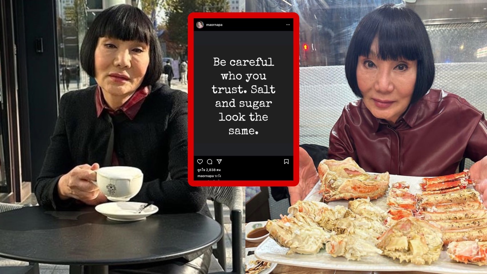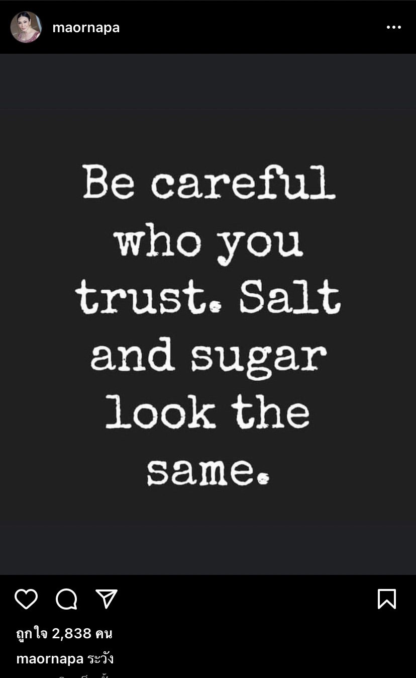 แต่ล่าสุด ม้า อรนภา ก็ได้ออกมาเคลื่อนไหวอีกครั้งผ่านอินสตาแกรม โดยได้โพสต์ข้อความเป็นภาษาอังกฤษว่า “Be careful who you trust. Salt and sugar look the same.” (ระวังคนที่คุณไว้วางใจ เกลือและน้ำตาลมีลักษณะเหมือนกัน) พร้อมกับเขียนแคปชั่นว่า “ระวัง”