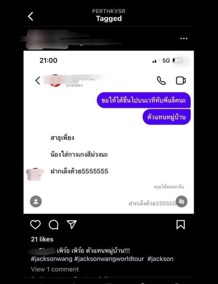 เอาแล้วว! กลิ่นดราม่าจนได้ เมื่อนางเอกสาวสวย เพิร์ธ วีริณฐ์ศรา ถูก แจ็คสัน หวัง พาขึ้นไปบนเวทีคอนเสิร์ตในวันที่ 2 ในฐานะลัคกี้แฟน แต่งานนี้ชาวทวิตถล่มยับ เพราะมีข้อความแชทหลุดออกมา ในทำนองที่ว่าตนเองใส่กางเกงสีม่วง ให้ช่วยเล็งๆ ไว้ด้วย