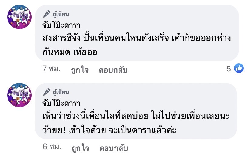 หลังจากนั้น ก็ได้ใบ้อีกว่า “เห็นว่าช่วงนี้เพื่อนไลฟ์สดบ่อย ไม่ไปช่วยเพื่อนเลยนะ ว้ายย! เข้าใจด้วย จะเป็นดาราแล้วค่ะ” และ “ สงสารชีจัง ปั้นเพื่อนคนไหนดังเสร็จ เค้าก็ขอออกห่างกันหมด เห้อออ”