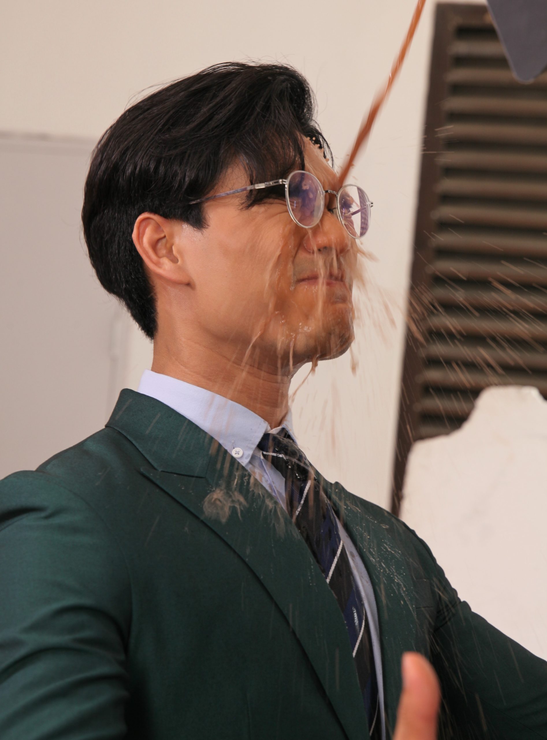 เบื้องหลังของฉากนี้บอกเลยว่าเละเทะหมดสภาพจริงๆ โดยเฉพาะโอ๊ต ที่รู้ชะตากรรมของตัวเองตั้งแต่อ่านบทแล้ว ว่าเรื่องนี้ต้องเละเกือบทั้งเรื่อง เพราะถูกเกรซกลั่นแกล้ง แล้ววันนี้ก็เป็นการเจอกันครั้งแรกของทั้งคู่ ผกก.เลยขอจัดให้หนักๆเป็นการสร้างความคุ้นเคย จะได้สนิทกันเร็วขึ้น ว่าแล้วเกรซก็เปิดศึกรับน้อง ขู่โอ๊ตว่ารู้กิตติศักดิ์ของเกรซยัง ว่าเวลาแสดงเกรซเต็มที่มากนะ เล่นจริง เจ็บจริง ไม่เชื่อไปถามพระเอกคนอื่นๆที่ร่วมงานกับเกรซได้เลย (หัวเราะ) โอ๊ตใจดีสู้เสือ บอกว่าใส่มาเต็มที่ได้เลย เพราะทำใจมาเละแล้ววันนี้ เปิดทางมาแบบนี้เข้าทางเกรซเลยจ้า ว่าแล้วก็เดินหน้าซ้อมคิวกันแบบหล่อๆสวยๆ ก่อนจะเปื้อนจริง เมื่อทุกอย่างลงตัว ก็ถึงเวลาที่โอ๊ตจะเละสมใจแล้ว