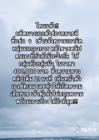 เเละยังโพสต์อีกว่า โดนแล้ว อดีตนางเอกดัง จ. เข้าแจ้งความเอาผิดหนุ่มนอกวงการ หลังขายคลิปตนเองที่กำลังมีอะไรกันให้กลุ่มลับกลุ่มหนึ่ง ในราคา 400,000 บาท คลิปเห็นหน้าทำให้เกิดความเสียหาย เจ้าตัวลั่นไม่ยอมความ พร้อมเอาเรื่องให้ถึงที่สุด!!!