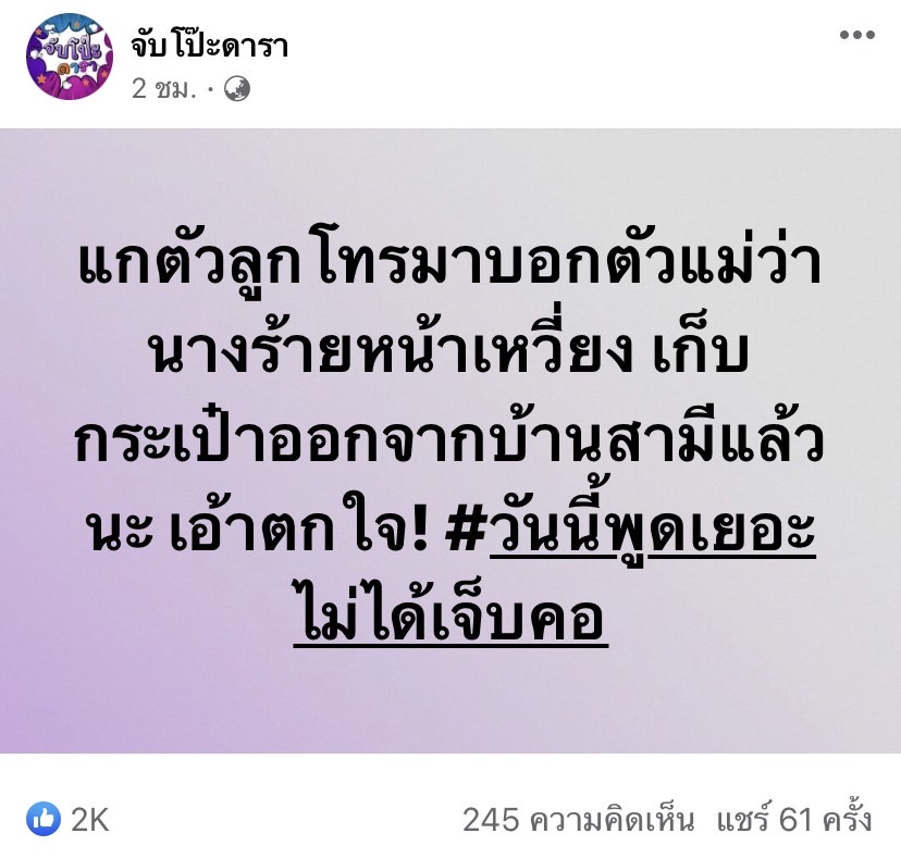 แต่ล่าสุดวันนี้ จับโป๊ะ ได้ออกมาโพสต์ว่า “แกตัวลูกโทรมาบอกตัวแม่ว่า นางร้ายหน้าเหวี่ยง เก็บกระเป๋าออกจากบ้านสามีแล้วนะ เอ้าตกใจ! #วันนี้พูดเยอะไม่ได้เจ็บคอ”