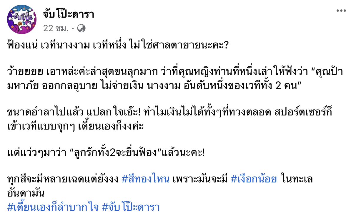 “ฟ้องแน่ เวทีนางงาม เวทีหนึ่ง ไม่ใช่ศาลตายายนะคะ? ว้ายยยย เอาหล่ะค่ะล่าสุดขนลุกมาก ว่าที่คุณหญิงท่านที่หนึ่งเล่าให้ฟังว่า “คุณป้ามหาภัย ออกกลอุบาย ไม่จ่ายเงิน นางงาม อันดับหนึ่งของเวทีทั้ง 2 คน” ขนาดอำลาไปแล้ว แปลกใจเอ๊ะ! ทำไมเงินไม่ได้ทั้งๆที่ทวงตลอด สปอนเซอร์ก็เข้าเวทีแบบจุกๆ เดี๊ยนเองก็งงค่ะ