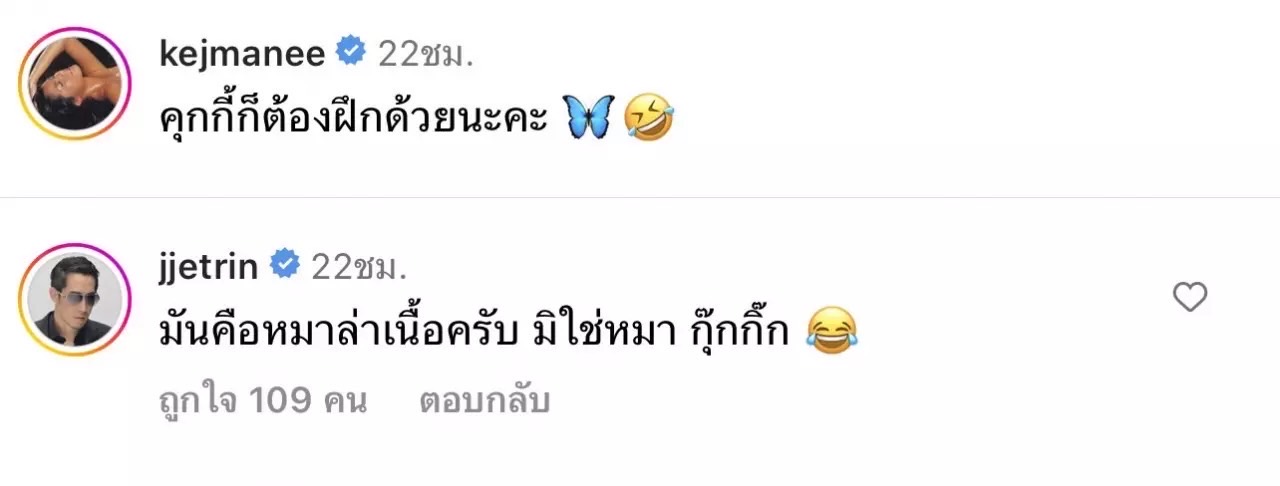 ส่วนโพสต์ที่สอง แม่ปิ่น ระบุแคปชั่นว่า “คุกกี้ก็ต้องฝึกด้วยนะคะ” พ่อเจ ได้คอมเมนต์ว่า “มันคือหมาล่าเนื้อครับ มิใช่หมา กุ๊กกิ๊ก”