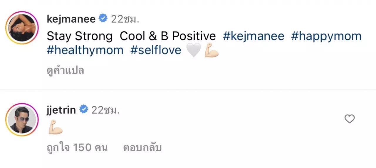 โดยโพสต์แรกของ แม่ปิ่น ระบุแคปชั่นว่า “Stay Strong Cool & B Positive #kejmanee #happymom #healthymom #selflove” พ่อเจ ได้คอมเมนต์ด้วยอีโมจิกล้ามโต