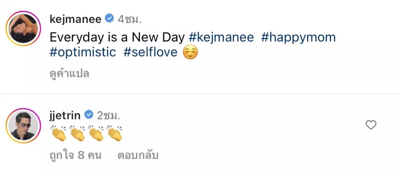 ส่วนโพสต์สุดท้ายได้เขียนแคปชั่นว่า “Everyday is a New Day #kejmanee #happymom #optimistic #selflove” พ่อเจ ได้คอมเมนต์อีโมจิปรบมือรัวๆ งานนี้ทำเอาแฟนคลับกรี๊ดกันรัวๆ เพราะถือเป็นโมเมนต์ที่ทุกคนต่างรอคอยมานานที่จะได้เห็น