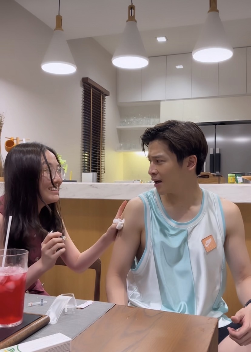 เอาหล่ะค่ะ ล่าสุด “มาร์ช จุฑาวุฒิ” ได้โพสต์คลิปน่ารัก ขณะ หมอเยลลี่ แฟนสาว กำลังฉีดวัคซีนให้ พร้อมแคปชั่นว่า “กิจกรรมคู่ ฉีดวัคซีนไข้หวัดใหญ่” โดยเป็นโมเมนต์คู่รัก แฟนสาวซึ่งเป็นคุณหมอกำลังใช้เข็มฉีดวัคซีนไข้หวัดใหญ่ให้หนุ่มมาร์ช แต่ออกจะดูตื่นเต้นอยู่สักหน่อย พร้อมบอกแฟนหนุ่มว่าอย่าเกร็ง หลังลงเข็มฉีดแล้วเห็นเลือดออกก็ถึงกับร้องตกใจ อุ๊ยลั่นเลือดออก หลังฉีดเสร็จ หนุ่มมาร์ชก็บอกสบายมาก ก่อนปล่อยมุขเป็นลมตกจากเก้าอี้ลงไปกองที่พื้น