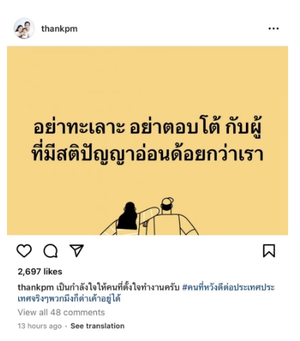 “อย่าทะเลาะ อย่าตอบโต้กับผู้ที่มีสติปัญญาอ่อนด้อยกว่าเรา” พร้อมแคปชั่นเป็นกำลังใจให้คนที่ตั้งใจทำงาน คนที่หวังดีต่อประเทศจริง ๆ พวกมึงก็ด่าเขาอยู่ได้