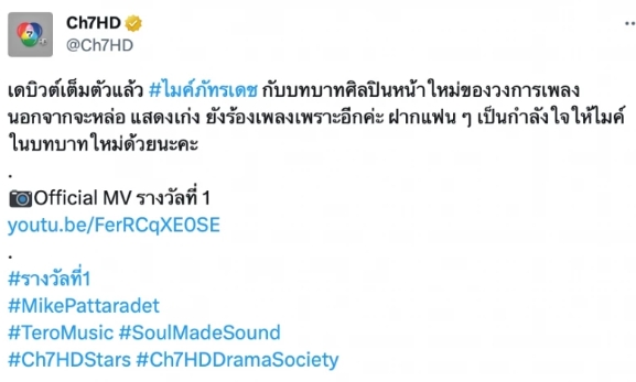 โดยทางด้าน 7HD ได้ออกมาโปรโมตเพลงใหม่ของ ไมค์ ภัทรเดช พร้อมข้อความว่า เดบิวต์เต็มตัวแล้ว #ไมค์ภัทรเดช กับบทบาทศิลปินหน้าใหม่ของวงการเพลง นอกจากจะหล่อ แสดงเก่ง ยังร้องเพลงเพราะอีกค่ะ ฝากแฟน ๆ เป็นกำลังใจให้ไมค์ในบทบาทใหม่ด้วยนะคะ Official MV รางวัลที่ 1