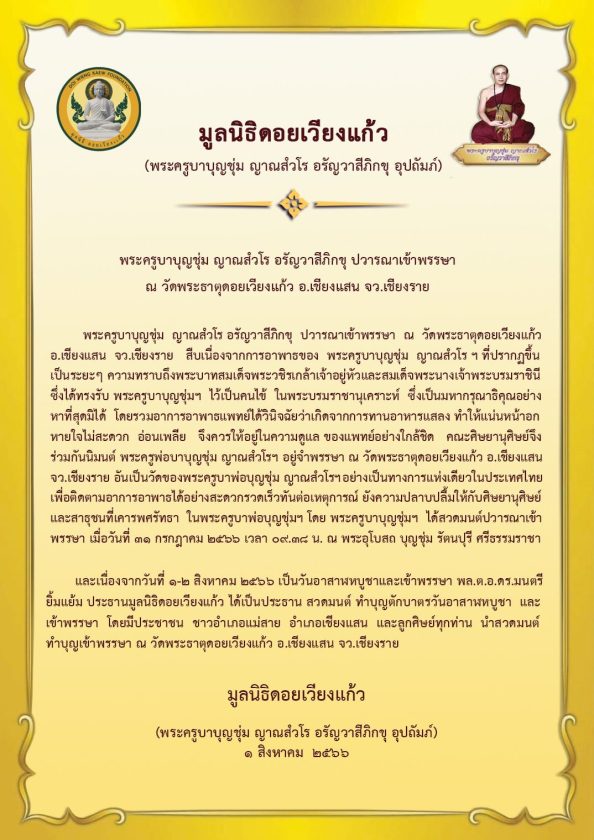 เข้าพรรษา วันนี้ 2 ส.ค.66 ผู้สื่อข่าวรายงานว่า เพจมูลนิธิดอยเวียงแก้วพระครูบาบุญชุ่ม ญาณสังวโร อรัญวาสีภิกขุ แจ้งว่าพระครูบาบุญชุ่ม ปวารณาเข้าพรรษา ณ วัดพระธาตุดอยเวียงแก้ว อ.เชียงแสน จ.เชียงราย สืบเนื่องจากการอาพาธของพระครูบาบุญชุ่มที่ปรากฏขึ้นเป็นระยะๆ โดยรวมอาการอาพาธ แพทย์ได้วินิจฉัยว่าเกิดจากอาการ รับประทานอาหารแสลง ทำให้แน่นหน้าอกหายใจไม่สะดวกอ่อนเพลีย จึงควรให้อยู่ในความดูแลของแพทย์อย่างใกล้ชิด