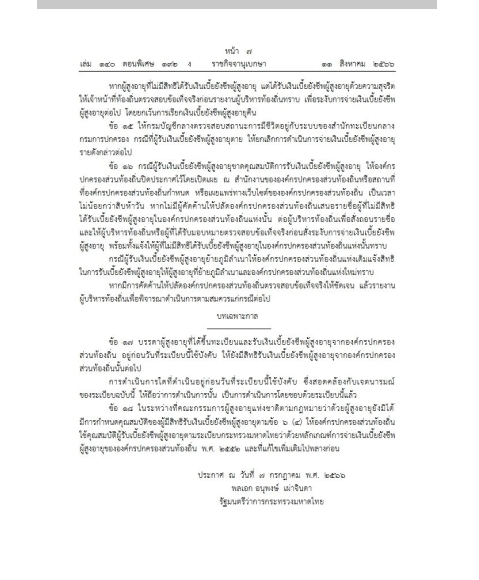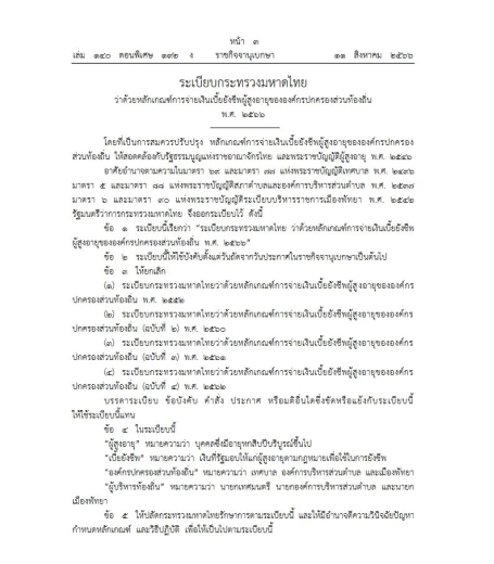 ราชกิจจานุเบกษาเผยแพร่ ระเบียบกระทรวงมหาดไทย ว่าด้วยหลักเกณฑ์การจ่ายเงินเบี้ยยังชีพผู้สูงอายุขององค์กรปกครองส่วนท้องถิ่น พ.ศ. 2566 โดยที่เป็นการสมควรปรับปรุง หลักเกณฑ์การจ่ายเงินเบี้ยยังชีพผู้สูงอายุขององค์กรปกครอง ส่วนท้องถิ่น ให้สอดคล้องกับรัฐธรรมนูญแห่งราชอาณาจักรไทย และพระราชบัญญัติผู้สูงอายุ พ.ศ. 2546