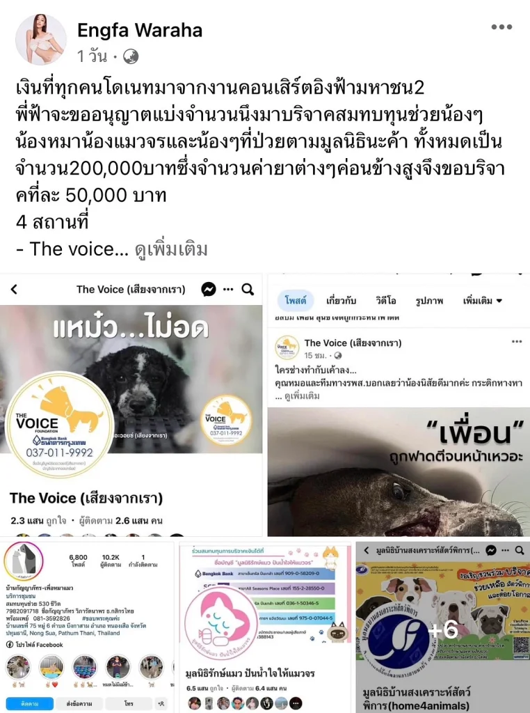 “เงินที่ทุกคนโดเนทมาจากงานคอนเสิร์ตอิงฟ้ามหาชน2 พี่ฟ้าจะขออนุญาตแบ่งจำนวนนึงมาบริจาคสมทบทุนช่วยน้องๆ น้องหมาน้องแมวจรและน้องๆที่ป่วยตามมูลนิธินะค้า ทั้งหมดเป็น จำนวน200,000บาทซึ่งจำนวนค่ายาต่างๆ ค่อนข้างสูงจึงขอบริจาคที่ละ 50,000 บาท