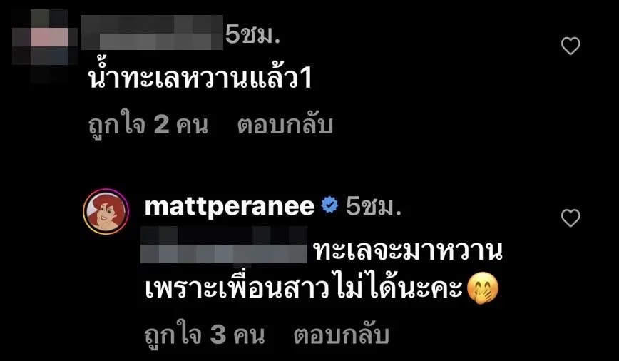 ล่าสุด “แมท” เฉลยแล้วว่าเจ้าของมือปริศนาคือใคร หลังมีชาวเน็ตเข้าไปคอมเมนต์แซวว่า “ทะเลหวานแล้ว1” ซึ่ง “แมท” ก็ตอบกลับแบบชัด ๆ เคลียร์ว่า “ทะเลจะมาหวานเพราะเพื่อนสาวไม่ได้นะคะ” ตามด้วยอิโมจิหัวเราะ