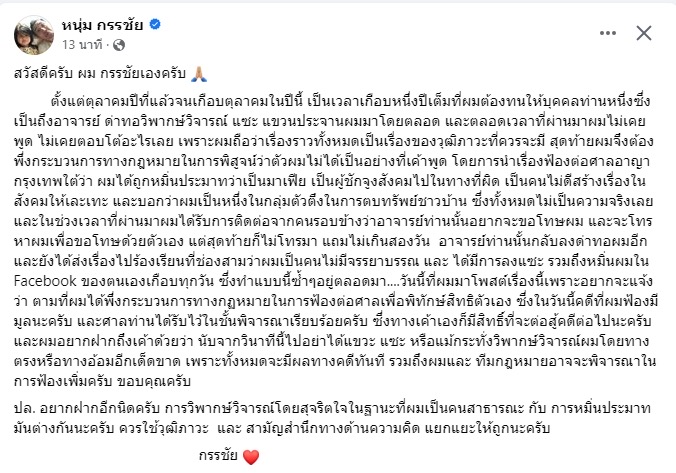 และบอกว่าผมเป็นหนึ่งในกลุ่มตัวตึงในการตบทรัพย์ชาวบ้าน ซึ่งทั้งหมดไม่เป็นความจริงเลย และในช่วงเวลาที่ผ่านมาผมได้รับการติดต่อจากคนรอบข้างว่าอาจารย์ท่านนั้นอยากจะขอโทษผม และจะโทรหาผมเพื่อขอโทษด้วยตัวเอง แต่สุดท้ายก็ไม่โทรมา แถมไม่เกินสองวัน อาจารย์ท่านนั้นกลับลงด่าทอผมอีก และยังได้ส่งเรื่องไปร้องเรียนที่ช่องสามว่าผมเป็นคนไม่มีจรรยาบรรณ และ ได้มีการลงแซะ รวมถึงหมิ่นผมใน Facebook ของตนเองเกือบทุกวัน ซึ่งทำแบบนี้ซ้ำๆอยู่ตลอดมา….วันนี้ที่ผมมาโพสต์เรื่องนี้เพราะอยากจะแจ้งว่า ตามที่ผมได้พึ่งกระบวนการทางกฏหมายในการฟ้องต่อศาลเพื่อพิทักษ์สิทธิตัวเอง