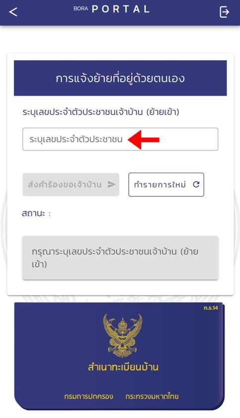 - กรอกเลขบัตรประชาชนของเจ้าบ้านที่เราจะย้ายเข้าไป
