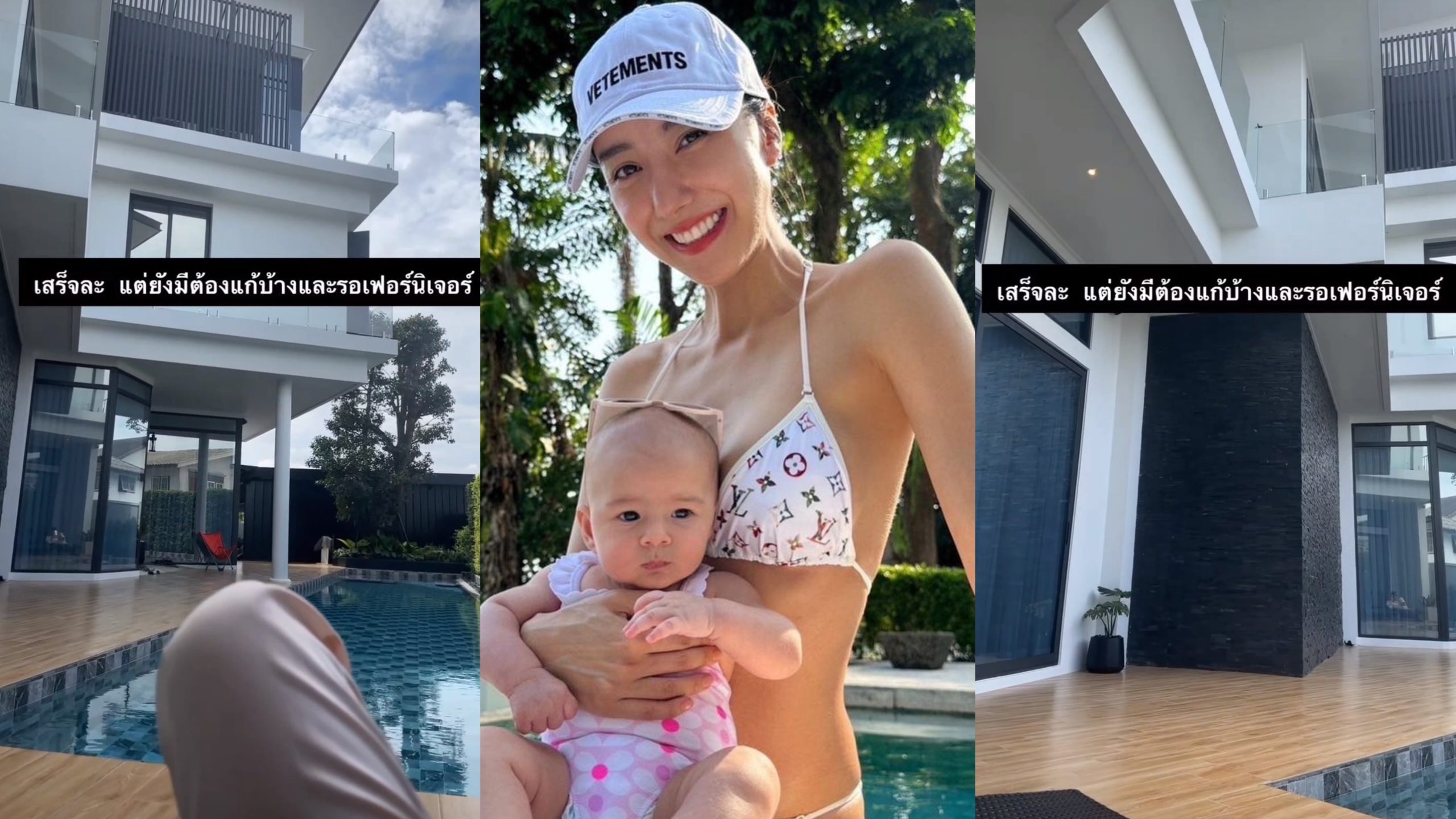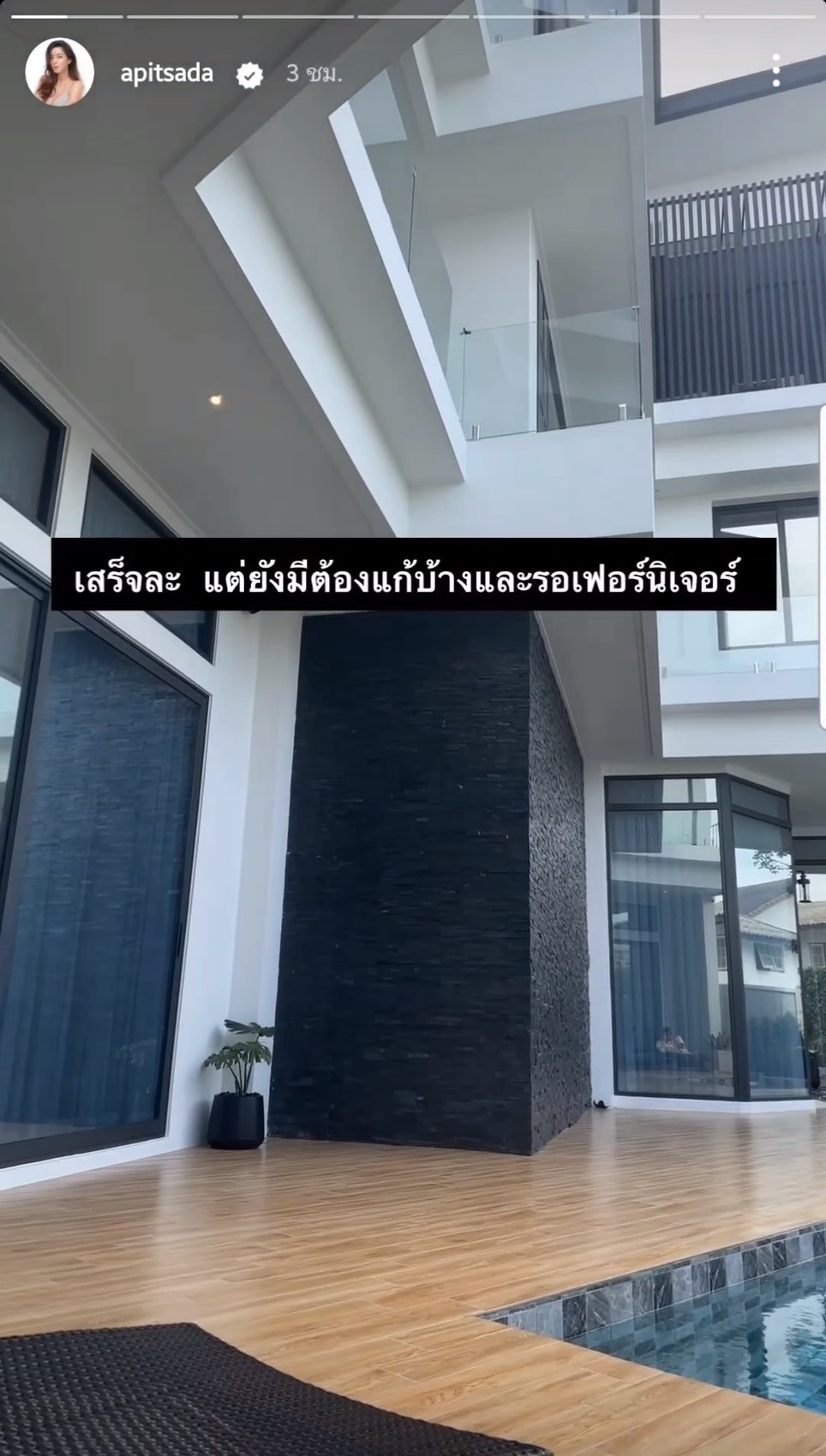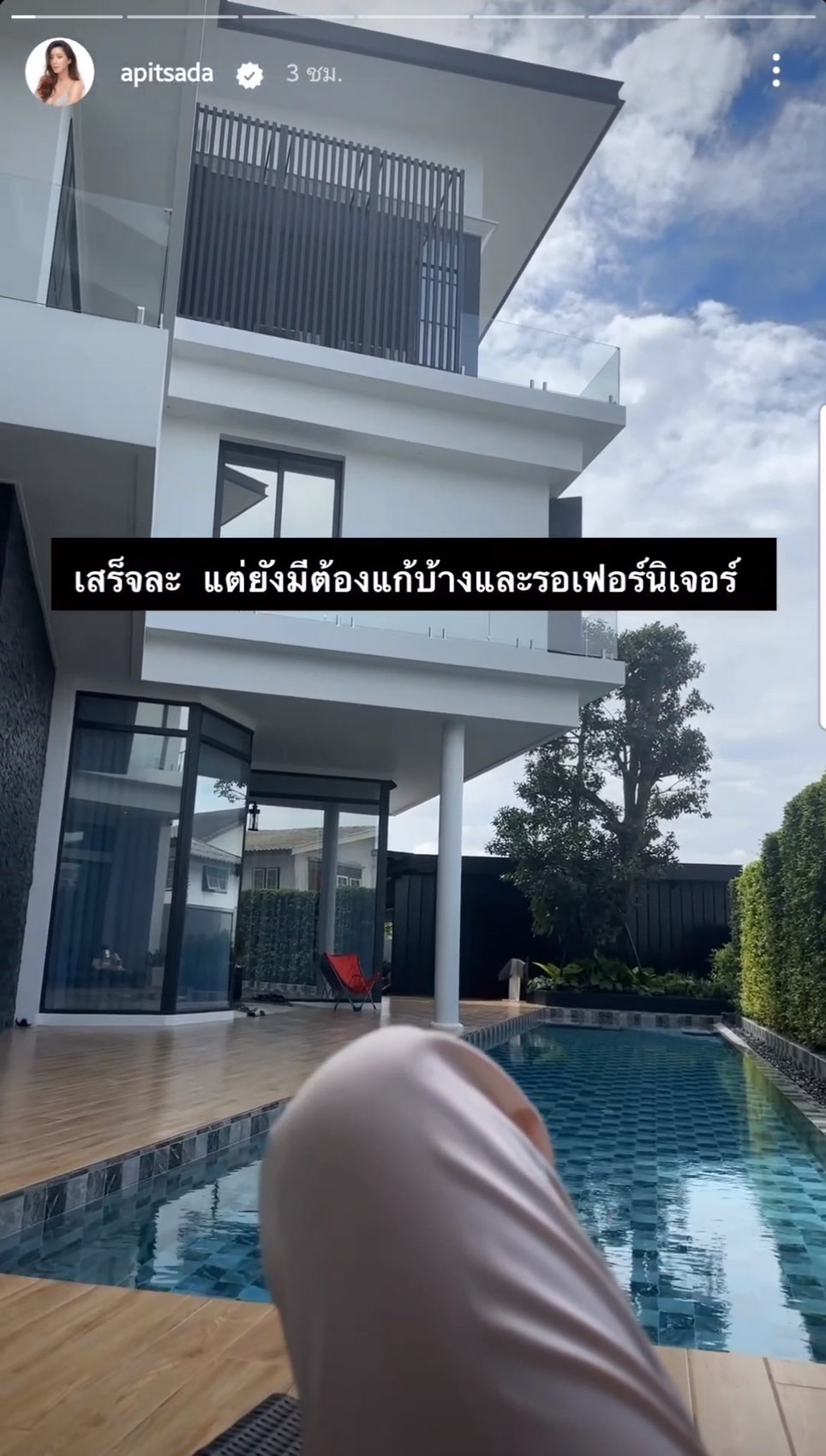 ยังได้ระบุแคปชั่นสั้นๆ บอกเล่าถึงรายละเอียดเล็กน้อย ขณะนอนแอบแดดชิลๆ ริมสระ เอาไว้ด้วยว่า “เสร็จละ แต่ยังมีต้องแก้บ้าง และรอเฟอร์นิเจอร์”
