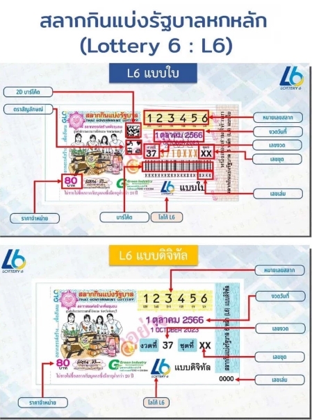 สำหรับสลากงวดวันที่ 1 ตุลาคม 2566 เริ่มขายมาตั้งแต่วันที่ 17 กันยายน 2566 ที่ผ่านมา ถือเป็นงวดแรกที่จะจำหน่ายสลากกินแบ่งรัฐบาลหกหลัก (Lottery 6: L6) ทั้งสลากใบ และสลากดิจิทัล รวม 101 ล้านฉบับ แบ่งเป็นสลากใบ 80 ล้านฉบับ และสลากดิจิทัล 21 ล้านฉบับ ทั้งนี้สลากใบจะมีลักษณะเหมือนกับสลากที่ขายอยู่ในปัจจุบันทุกประการคือ มีการพิมพ์บนกระดาษป้องกันการปลอมแปลง มีลายน้ำ และเส้นไหมสอดแทรกอยู่ในเนื้อกระดาษ มีการพิมพ์สัญลักษณ์ป้องกันการปลอมแปลงต่าง ๆ รวมถึงพิมพ์ข้อความ L6 แบบใบ ลงบนสลากด้วยในขณะที่ สลากดิจิทัล ไม่ได้มีการพิมพ์ขึ้นมาเป็นใบ แต่เป็นข้อมูลที่อยู่ในระบบดิจิทัล มีการพิมพ์ข้อความ L6 แบบดิจิทัล บนสลาก และทำการซื้อขายผ่านแอพเป๋าตัง