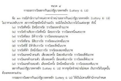 เวปไซน์ราชกิจจานุเบกษา ได้เผยแพร่ประกาศสำนักงานสลากกินแบ่งรัฐบาล เรื่อง การออกสลากกินแบ่งรัฐบาลหกหลัก (Lottery 6: L6) ลงนามโดยพันโท หนุน ศันสนาคม ผู้อำนวยการสำนักงานสลากกินแบ่งรัฐบาล