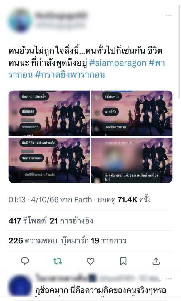 วันนี้(6 ต.ค 66) ผู้สื่อข่าวรายงานว่า พล.ต.ท.ธิติ แสงสว่าง ผบช.น. ได้สั่งการให้เจ้าหน้าที่ชุดสืบสวน ติดตามบุคคลที่ปรากฏอยู่ในแชทจากกรณี ที่มีการปรากฎบทสนทนาบนโลกโซเชียล ที่มีความเกี่ยวข้องกับเด็ก 14 ปี ที่ก่อเหตุยิงที่พารากอน โดยภายในแชทได้ปรากฎข้อความในเชิงพาดพิงและบูลลี่ผู้บาดเจ็บและเสียชีวิต และตัวผู้ก่อเหตุ