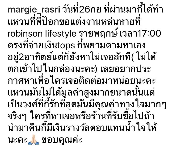 “มาร์กี้” ได้แจ้งเรื่องดังกล่าวผ่านอินสตาแกรมส่วนตัว@margie_rasri พร้อมข้อความระบุว่า “วันที่ 26 ก.ย. ที่ผ่านมากี้ได้ทำแหวนที่พี่ป๊อกขอแต่งงานหล่นหายที่ robinson lifestyle ราชพฤกษ์ เวลา17:00 ตรงที่จ่ายเงินtops กี้พยายามตามหาเองอยู่ 2 อาทิตย์แต่ก็ยังหาไม่เจอสักที( ไม่ได้ตกเข้าไปในกล่องนะคะ) เลยอยากประกาศหาเพื่อใครเจอติดต่อมาหน่อยนะคะ แหวนมันไม่ได้มูลค่าสูงมากขนาดนั้นแต่เป็นวงที่กี้รักที่สุดมันมีคุณค่าทางใจมาก ๆ จริง ๆ ใครที่หาเจอหรือร้านที่รับซื้อไปถ้านำมาคืนกี้มีเงินรางวัลตอบแทนน้ำใจให้นะคะ🙏🏻 ขอบคุณค่ะ”
