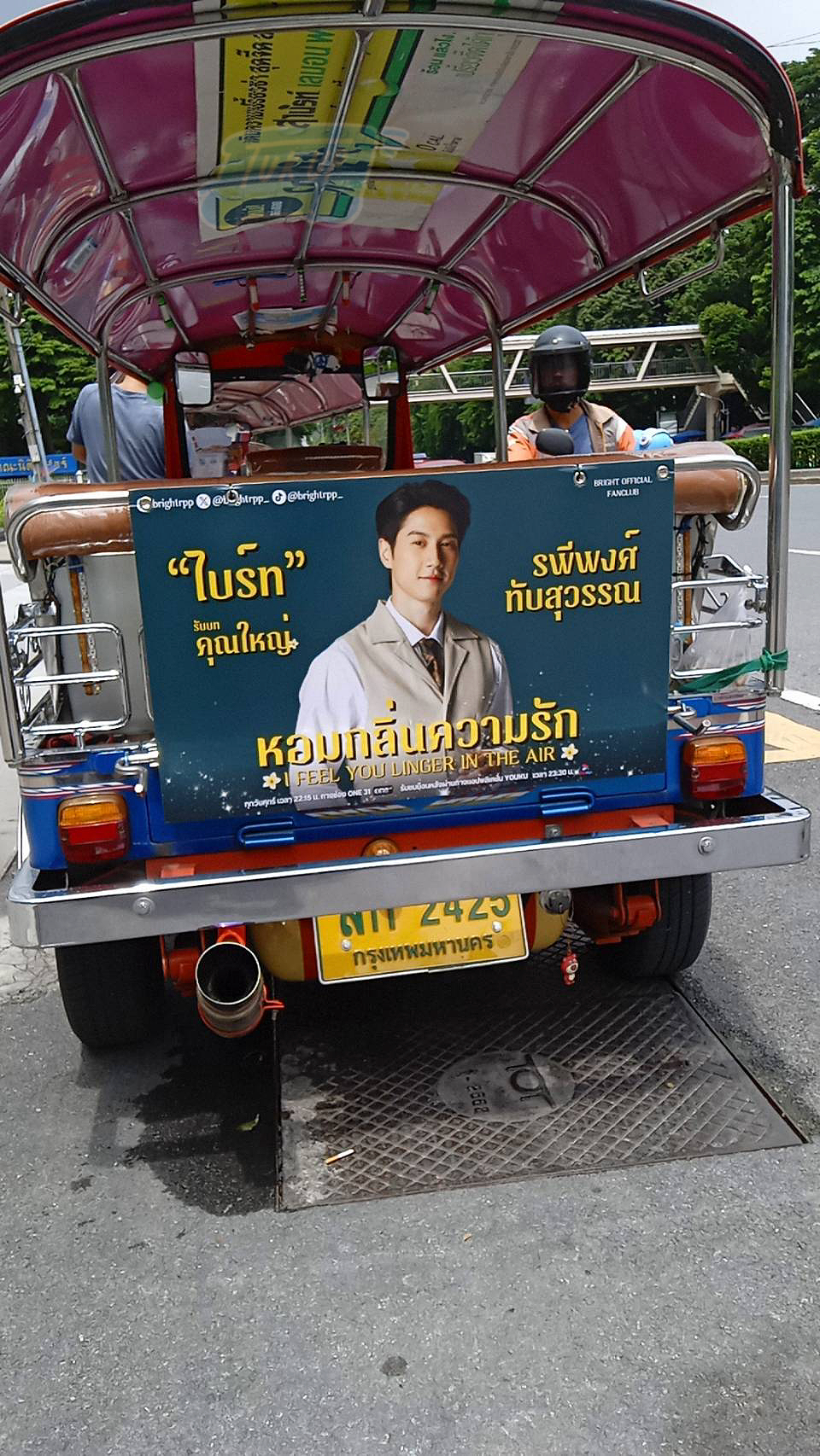 แถมแฟนคลับ Bright Official Fanclub ก็ยังเสิร์ฟรักเต็มที่ ทั้งเหมาจอ LED ยักษ์ บริเวณหน้าห้างสรรพสินค้า MBK Center เปิดคลิปหนุ่มไบร์ทที่มีความยาว 30 วินาที วนไปทั้งวันทั้งคืน เป็นเวลานานกว่า 1 สัปดาห์ เท่านั้นไม่พอ! ยังเหมาป้ายโฆษณาท้ายรถตุ๊กตุ๊ก ย่านสยามสแควร์ ติดโปสเตอร์รูปคุณใหญ่ เพื่อซัพพอร์ตหนุ่มไบร์ท และโปรโมทซีรีส์หอมกลิ่นความรักไปพร้อมๆ กัน