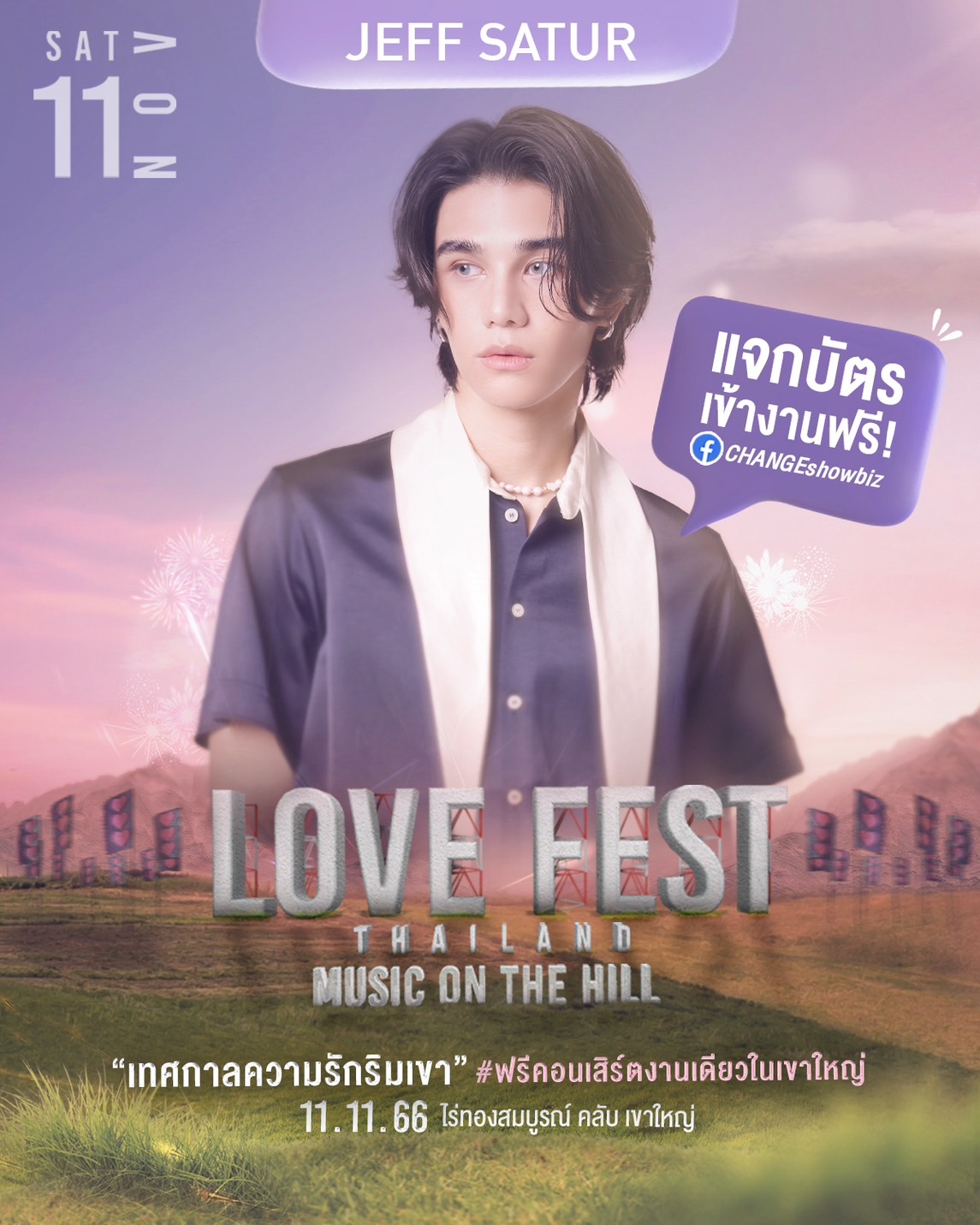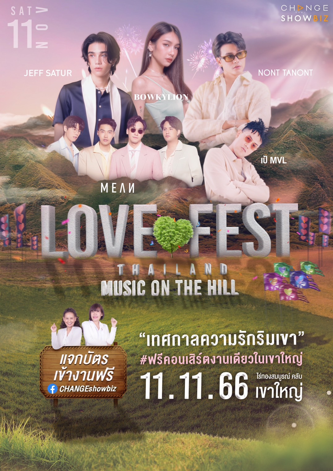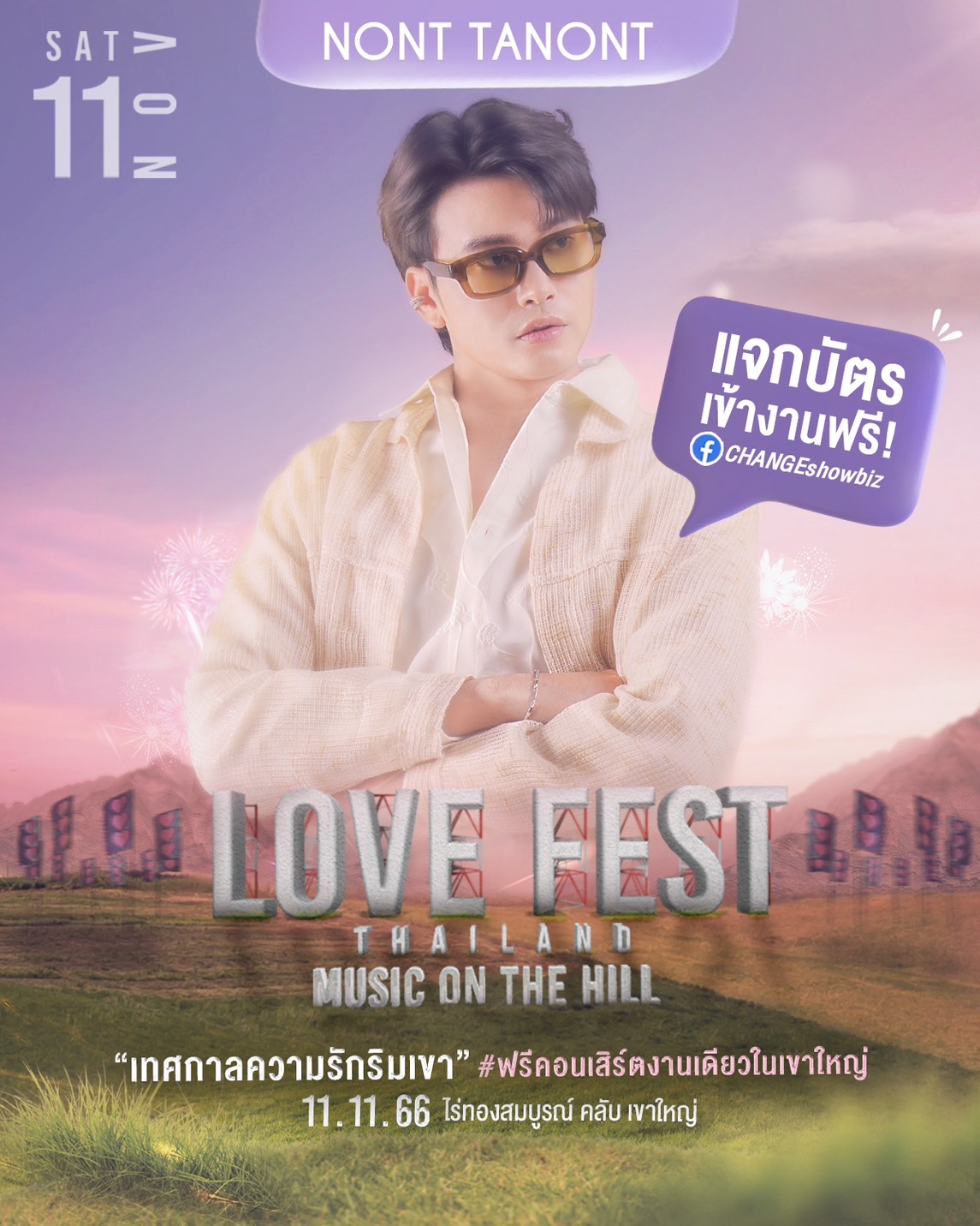 กลับมาอีกครั้งกับ FREE FEST เทศกาลดนตรีและเลิฟสไตล์ CHANGEshowbiz กับงาน LOVE FEST THAILAND 2023 “MUSIC ON THE HILL” กับการจัดงานครั้งแรกที่เขาใหญ่ ที่เพียงเปิดให้ลงทะเบียนกดรับบัตรเข้างานฟรีไม่กี่นาที “บัตรหมดเกลี้ยง” พร้อมชวนคนมีความรักทุก สเตตัส ไม่ว่าจะมีคู่ อกหัก โดยเฉพาะ “คนโสด” เพราะวันจัดงานตรงกับวันคนโสด เตรียมชวนกันไปรับพลังงานความรัก “นั่งฟังเพลงริมเขาแบบไม่เหงา” ผ่านเพลงรักเพราะๆ จากศิลปินตัวท็อปที่ CHANGEshowbiz ขนมาแน่นเวที “ นนท์ ธนนท์ – JEFF SATUR – BOWKYLION – เป้ MVL – MEAN ”