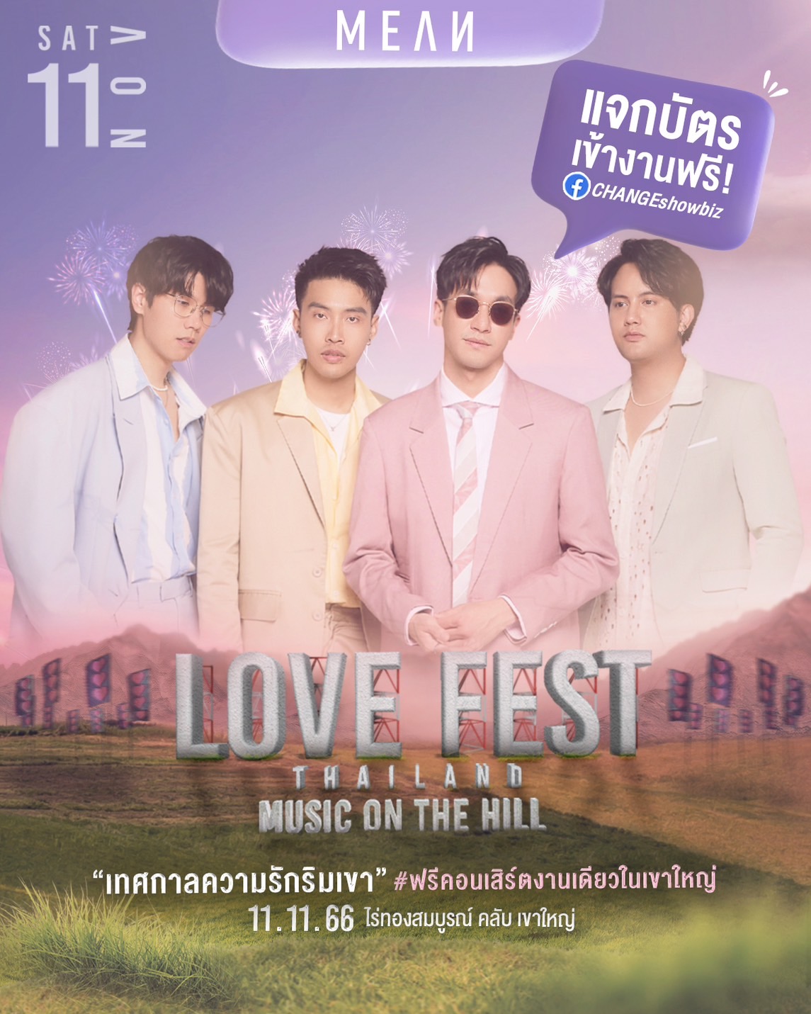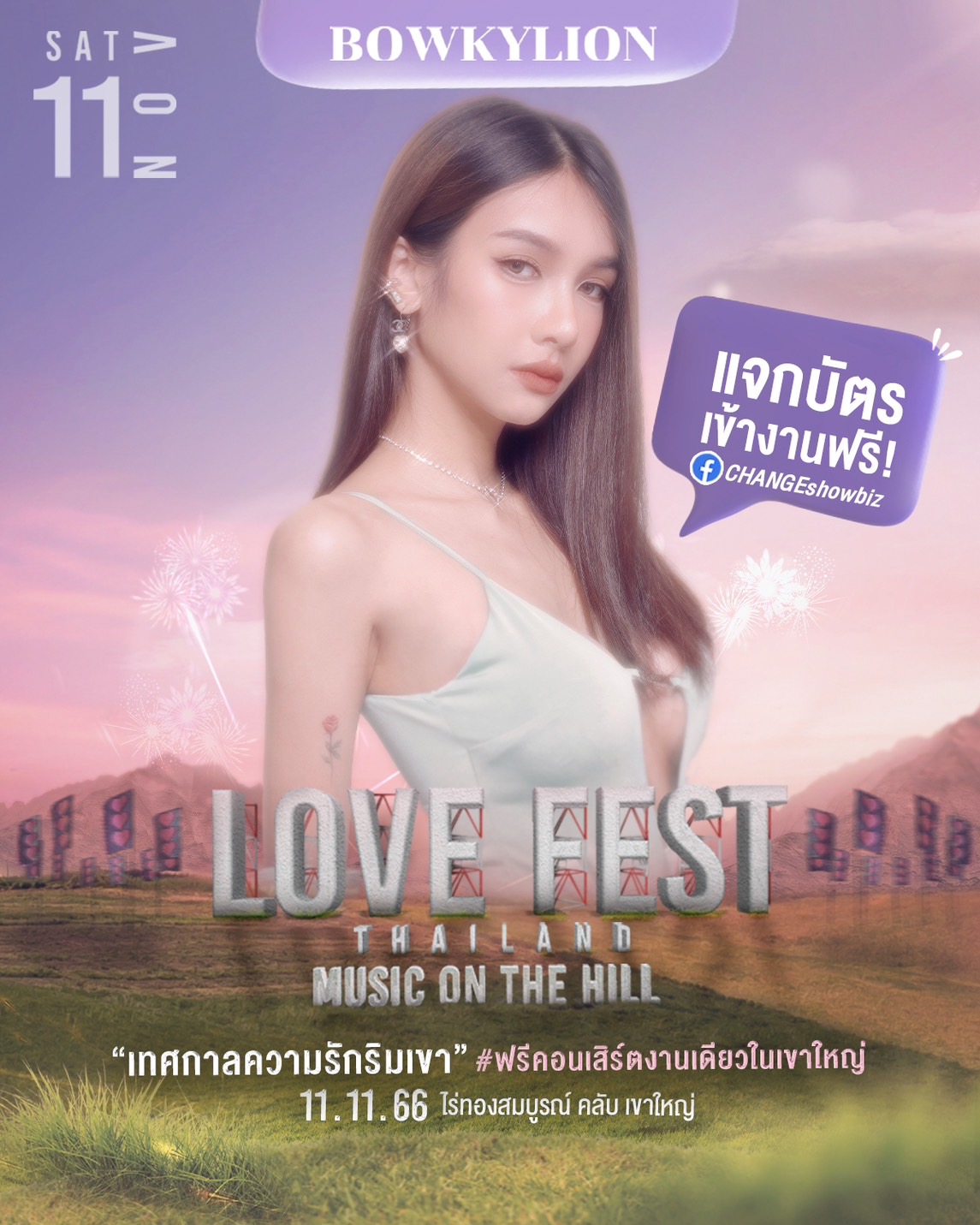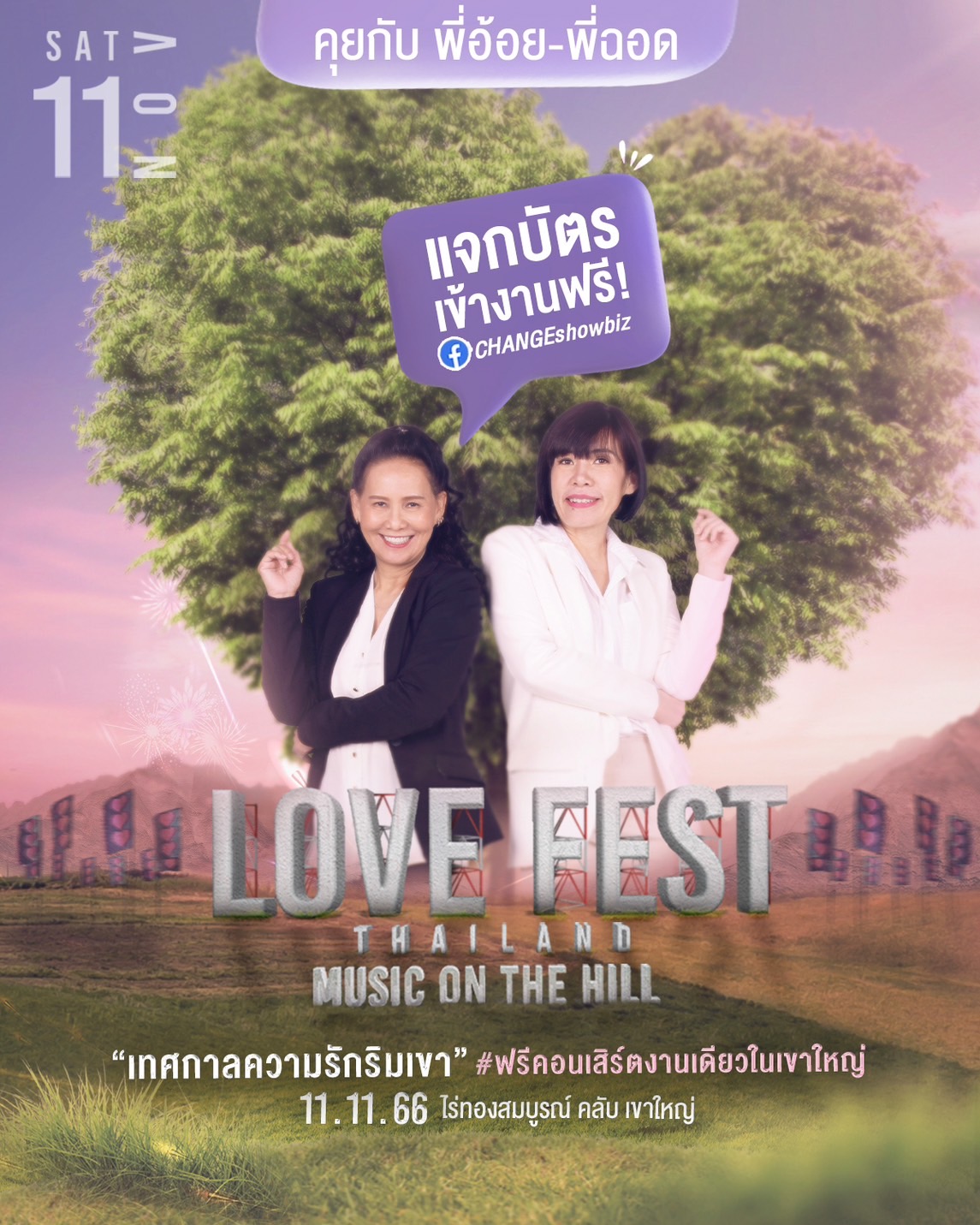 กลับมาอีกครั้งกับ FREE FEST เทศกาลดนตรีและเลิฟสไตล์ CHANGEshowbiz กับงาน LOVE FEST THAILAND 2023 “MUSIC ON THE HILL” กับการจัดงานครั้งแรกที่เขาใหญ่ ที่เพียงเปิดให้ลงทะเบียนกดรับบัตรเข้างานฟรีไม่กี่นาที “บัตรหมดเกลี้ยง” พร้อมชวนคนมีความรักทุก สเตตัส ไม่ว่าจะมีคู่ อกหัก โดยเฉพาะ “คนโสด” เพราะวันจัดงานตรงกับวันคนโสด เตรียมชวนกันไปรับพลังงานความรัก “นั่งฟังเพลงริมเขาแบบไม่เหงา” ผ่านเพลงรักเพราะๆ จากศิลปินตัวท็อปที่ CHANGEshowbiz ขนมาแน่นเวที “ นนท์ ธนนท์ – JEFF SATUR – BOWKYLION – เป้ MVL – MEAN ”