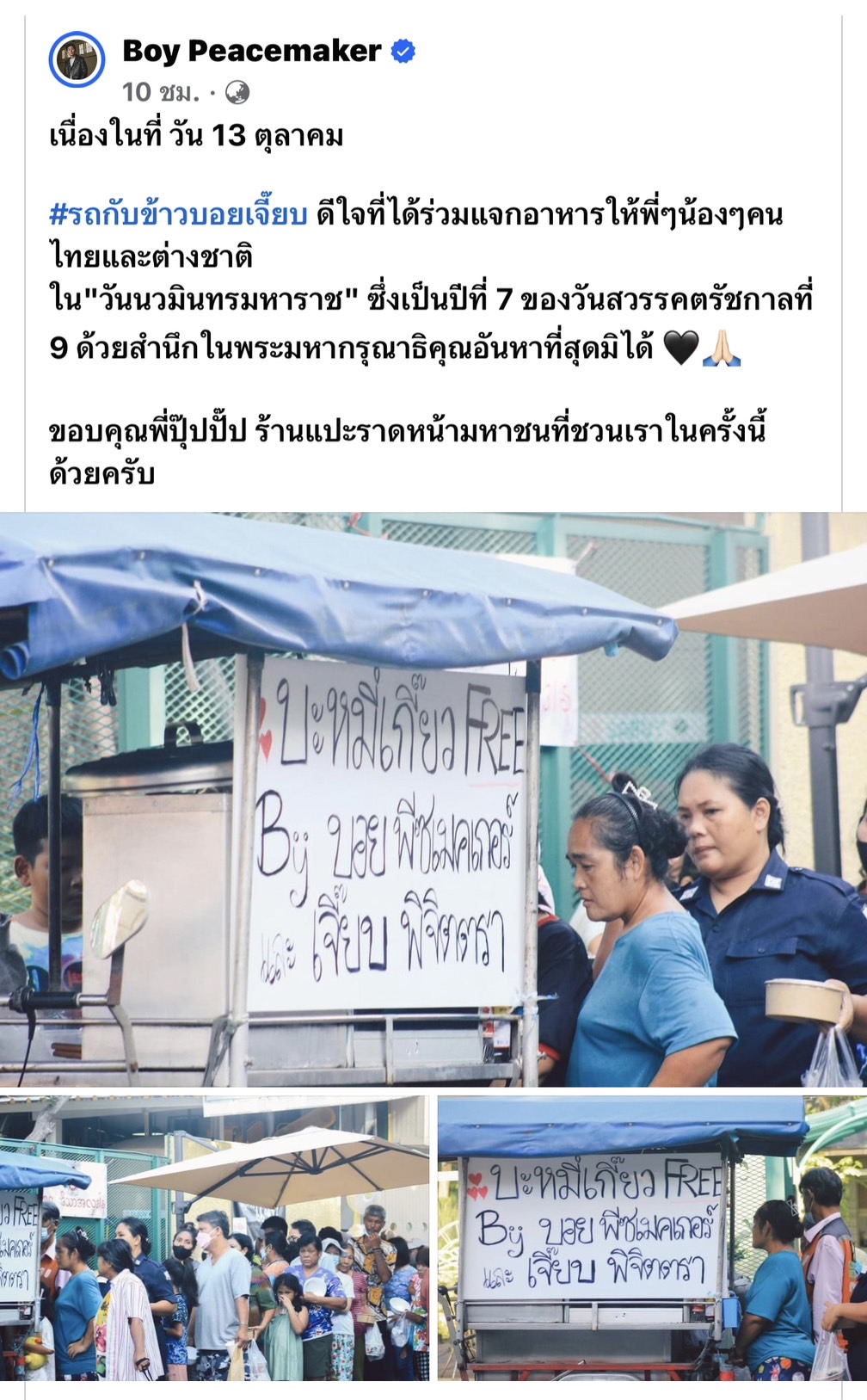 เนื่องใน “วันนวมินทรมหาราช” 13 ตุลาคม 2566 ที่ผ่านมา ซึ่งเป็นวันคล้ายวันสวรรคต ของพระบาทสมเด็จพระบรมชนกาธิเบศร มหาภูมิพลอดุลยเดชมหาราช บรมนาถบพิตร ในหลวงรัชกาลที่ ๙ เหล่าประชาชนคนไทย ต่างก็ร่วมใจกันออกมาโพสต์ภาพและข้อความ เพื่อน้อมรำลึกในพระมหากรุณาธิคุณ ซึ่งเหล่าดาราคนบันเทิงต่างออกมาโพสต์รูปและข้อความซึ้งๆ มากมายร่วมถึงคู่ของ บอย อนุวัฒน์ และ เจี๊ยบ พิจิตตรา ที่ได้ แจกราดหน้าให้ประชาชนฟรี “ที่หน้าร้าน แปะราดหน้ามหาชน แถวสนามบินน้ำ