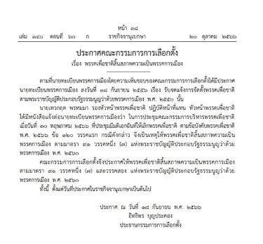 เว็บไซต์ ราชกิจจานุเบกษา เผยแพร่ ประกาศคณะกรรมการการเลือกตั้ง เรื่อง “พรรคเพื่อชาติ” สิ้นสภาพความเป็นพรรคการเมือง โดยมีรายละเอียดดังต่อไปนี้