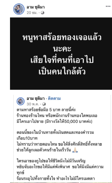 นักร้องลูกทุ่งสาวเสียงดี “อาม ชุติมา” ก่อนหน้านี้เจ้าตัวได้โพสต์ข้อความผ่านเฟซบุ๊ก “อาม ชุติมา” ตามหาสร้อยข้อมือทองคำที่หายไปพร้อมกับระบุหากใครพบเจอมีรางวัลให้ 5 หมื่นบาท และยังระบุอีกว่าตอนนี้ของในบ้านหายทั้งเงินสดและทองคำเกือบ 10 บาท