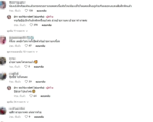 ซึ่งทาง สาวเอ๋ มิรา ตอบว่า “หนูกับปุ๊ปเลิกกันสักพักหนึ่งแล้วค่ะ ส่วนอ้ายผาแดง อ้ายมาทำงานค่ะ” ซึ่งก็มีชาวเน็ตเข้ามาคอมเมนต์ให้กำลังใจมากมาย เช่น ผู้หญิงเก่ง สตรองมักผิดหวังในเรื่องความรักน่าจะจริง ติดตามตั้งแต่ข่าวเอ๋กะอดีตคนรักแรกๆเลย ครั้งนี้ครั้งแรกที่จะเมนต์ เราขอเป็นกำลังใจให้เอ๋นะ , หากคุณเอ๋มีความรักใหม่อีกครั้งขอเป็นกำลังใจให้นะคะ มีความสุขมากๆ สมหวัง เราติดตามคุณตั้งแต่มีข่าวกับอดีตคน