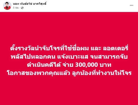 “ตั้งรางวัลนำจับโจรที่ใช้ชื่อผม และ ลอตเตอรี่พลัสไปหลอกคน แจ้งเบาะแส จนสามารถจับดำเนินคดีได้ จ่าย 300,000 บาท โอกาสของพวกคุณแล้ว ลูกน้องที่ทำงานให้โจร”
