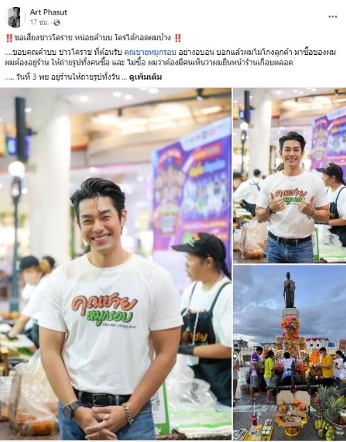 และเมื่อเข้าไปส่องความเคลื่อนไหว ของ อาร์ต พศุตม์ บานแย้ม หลังเกิดดราม่า่รสแซ่บ ก็พบว่า กำลังขายหมูกรอบ อยู่ที่โคราช พร้อมเขียนข้อความว่า