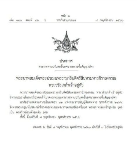 หลังจาก เว็บไซค์ราชกิจจานุเบกษา ได้เผยประกาศ พระราชทานปรับลดชั้นยศนายทหารชั้นสัญญาบัตร โดยมีเนื้อหาดังนี้ พระบาทสมเด็จพระปรเมนทรรามาธิบดีศรีสินทรมหาวชิราลงกรณ พระวชิรเกล้าเจ้าอยู่หัว มีพระบรมราชโองการโปรดเกล้าโปรดกระหม่อมพระราชทานปรับลดชั้นยศนายทหารชั้นสัญญาบัตร