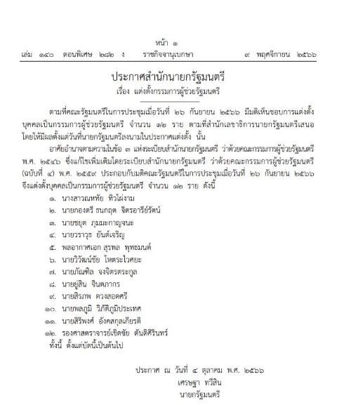 อาศัยอำนาจตามความในข้อ ๓ แห่งระเบียบสำนักนายกรัฐมนตรี ว่าด้วยคณะกรรมการผู้ช่วยรัฐมนตรี พ.ศ. ๒๕๔๖ ซึ่งแก้ไขเพิ่มเติมโดยระเบียบสำนักนายกรัฐมนตรี ว่าด้วยคณะกรรมการผู้ช่วยรัฐมนตรี (ฉบับที่ ๔) พ.ศ. ๒๕๕๙ ประกอบกับมติคณะรัฐมนตรีในการประชุมเมื่อวันที่ ๒๖ กันยายน ๒๕๖๖ จึงแต่งตั้งบุคคลเป็นกรรมการผู้ช่วยรัฐมนตรี จำนวน ๑๒ ราย ดังนี้