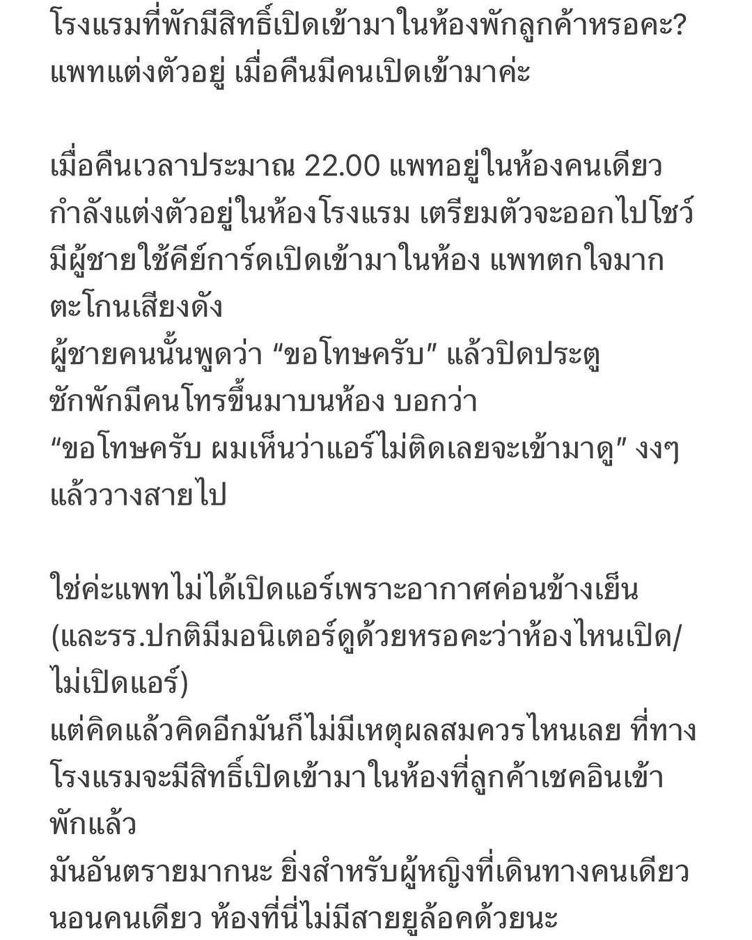 โดยสาว แพท ต้องออกมาโพสต์เล่าเรื่องราวดังกล่าว ลงอินสตาแกรมส่วนตัวว่า “โรงแรมที่พักมีสิทธิ์เปิดเข้ามาในห้องพักลูกค้าเหรอคะ? แพทแต่งตัวอยู่ เมื่อคืนมีผู้ชายเปิดเข้ามาค่ะ เมื่อคืนเวลาประมาณ 22.00 แพทอยู่ในห้องคนเดียว กำลังแต่งตัวอยู่ในห้องโรงแรม เตรียมตัวจะออกไปโชว์ มีผู้ชายใช้คีย์การ์ดเปิดเข้ามาในห้อง แพทตกใจมากตะโกนเสียงดัง ผู้ชายคนนั้นพูดว่า “ขอโทษครับ” แล้วปิดประตู