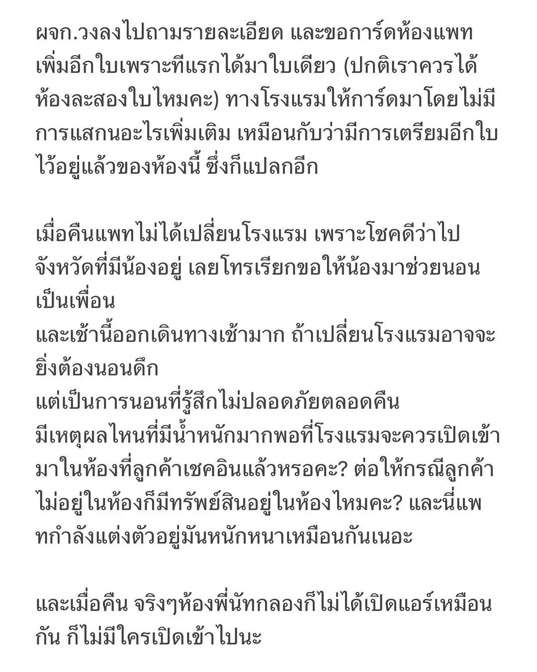 ผจก.วงลงไปถามรายละเอียด และขอการ์ดห้องแพทเพิ่มอีกใบเพราะทีแรกได้มาใบเดียว (ปกติเราควรได้ห้องละสองใบไหมคะ) ทางโรงแรมให้การ์ดมาโดยไม่มีการสแกนอะไรเพิ่มเติม เหมือนกับว่ามีการเตรียมอีกใบไว้อยู่แล้วของห้องนี้ ซึ่งก็แปลกอีก เมื่อคืนแพทไม่ได้เปลี่ยนโรงแรม เพราะโชคดีว่าไปจังหวัดที่มีน้องอยู่ เลยโทรเรียกขอให้น้องมาช่วยนอนเป็นเพื่อน และเช้านี้ออกเดินทางเช้ามาก ถ้าเปลี่ยนโรงแรมอาจจะยิ่งต้องนอนดึก แต่เป็นการนอนที่รู้สึกไม่ปลอดภัยตลอดคืน